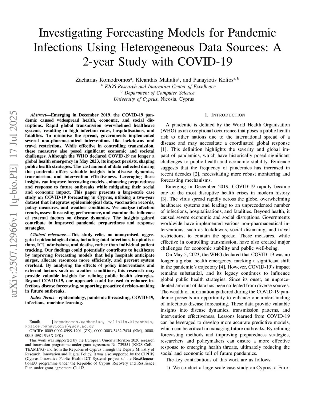 Emerging in December 2019, the COVID-19 pandemic caused widespread health, economic, and social disruptions. Rapid global transmission overwhelmed healthcare systems, resulting in high infection rates, hospitalisations, and fatalities. To minimise the spread, governments implemented several non-pharmaceutical interventions like lockdowns and travel restrictions. While effective in controlling transmission, these measures also posed significant economic and societal challenges. Although the WHO declared COVID-19 no longer a global health emergency in May 2023, its impact persists, shaping public health strategies. The vast amount of data collected during the pandemic offers valuable insights into disease dynamics, transmission, and intervention effectiveness. Leveraging these insights can improve forecasting models, enhancing preparedness and response to future outbreaks while mitigating their social and economic impact. This paper presents a large-scale case study on COVID-19 forecasting in Cyprus, utilising a two-year dataset that integrates epidemiological data, vaccination records, policy measures, and weather conditions. We analyse infection trends, assess forecasting performance, and examine the influence of external factors on disease dynamics. The insights gained contribute to improved pandemic preparedness and response strategies.