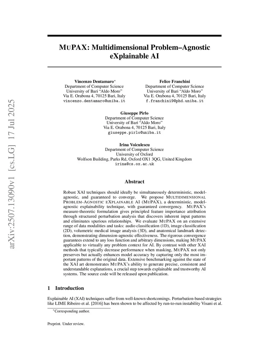 Robust XAI techniques should ideally be simultaneously deterministic, model agnostic, and guaranteed to converge. We propose MULTIDIMENSIONAL PROBLEM AGNOSTIC EXPLAINABLE AI (MUPAX), a deterministic, model agnostic explainability technique, with guaranteed convergency. MUPAX measure theoretic formulation gives principled feature importance attribution through structured perturbation analysis that discovers inherent input patterns and eliminates spurious relationships. We evaluate MUPAX on an extensive range of data modalities and tasks: audio classification (1D), image classification (2D), volumetric medical image analysis (3D), and anatomical landmark detection, demonstrating dimension agnostic effectiveness. The rigorous convergence guarantees extend to any loss function and arbitrary dimensions, making MUPAX applicable to virtually any problem context for AI. By contrast with other XAI methods that typically decrease performance when masking, MUPAX not only preserves but actually enhances model accuracy by capturing only the most important patterns of the original data. Extensive benchmarking against the state of the XAI art demonstrates MUPAX ability to generate precise, consistent and understandable explanations, a crucial step towards explainable and trustworthy AI systems. The source code will be released upon publication.