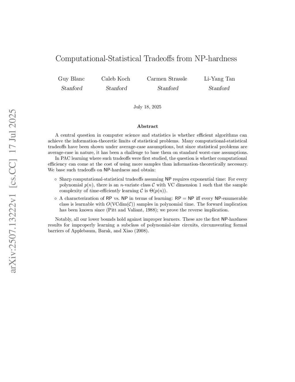 A central question in computer science and statistics is whether efficient algorithms can achieve the information-theoretic limits of statistical problems. Many computational-statistical tradeoffs have been shown under average-case assumptions, but since statistical problems are average-case in nature, it has been a challenge to base them on standard worst-case assumptions.In PAC learning where such tradeoffs were first studied, the question is whether computational efficiency can come at the cost of using more samples than information-theoretically necessary. We base such tradeoffs on -hardness and obtain: Sharp computational-statistical tradeoffs assuming requires exponential time: For every polynomial , there is an -variate class with VC dimension such that the sample complexity of time-efficiently learning is . A characterization of vs. in terms of learning: iff every -enumerable class is learnable with samples in polynomial time. The forward implication has been known since (Pitt and Valiant, 1988); we prove the reverse implication.Notably, all our lower bounds hold against improper learners. These are the first -hardness results for improperly learning a subclass of polynomial-size circuits, circumventing formal barriers of Applebaum, Barak, and Xiao (2008).