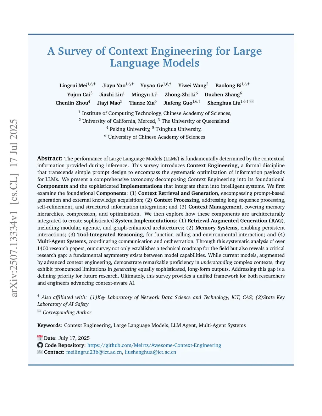 The performance of Large Language Models (LLMs) is fundamentally determined by the contextual information provided during inference. This survey introduces Context Engineering, a formal discipline that transcends simple prompt design to encompass the systematic optimization of information payloads for LLMs. We present a comprehensive taxonomy decomposing Context Engineering into its foundational components and the sophisticated implementations that integrate them into intelligent systems. We first examine the foundational components: context retrieval and generation, context processing and context management. We then explore how these components are architecturally integrated to create sophisticated system implementations: retrieval-augmented generation (RAG), memory systems and tool-integrated reasoning, and multi-agent systems. Through this systematic analysis of over 1400 research papers, our survey not only establishes a technical roadmap for the field but also reveals a critical research gap: a fundamental asymmetry exists between model capabilities. While current models, augmented by advanced context engineering, demonstrate remarkable proficiency in understanding complex contexts, they exhibit pronounced limitations in generating equally sophisticated, long-form outputs. Addressing this gap is a defining priority for future research. Ultimately, this survey provides a unified framework for both researchers and engineers advancing context-aware AI.