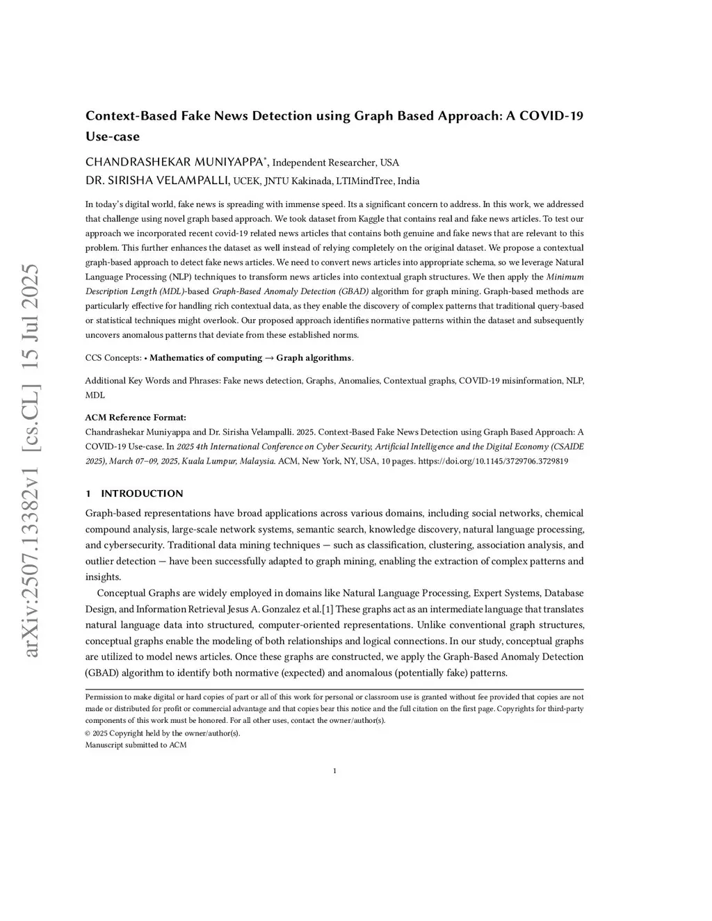 Context-Based Fake News Detection using Graph Based Approach: ACOVID-19 Use-case