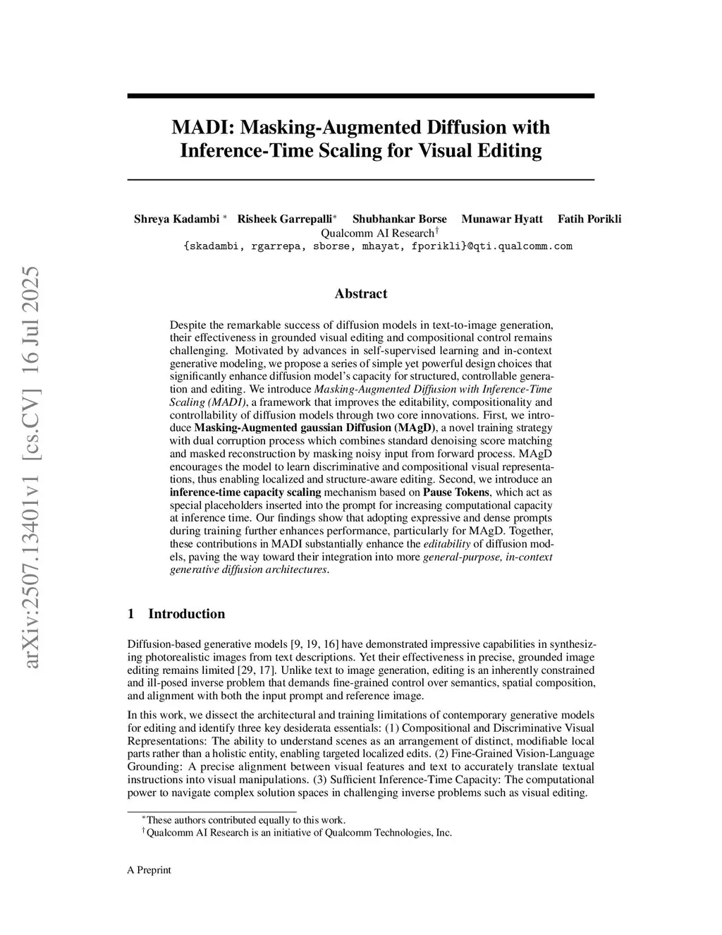 Despite the remarkable success of diffusion models in text-to-image generation, their effectiveness in grounded visual editing and compositional control remains challenging. Motivated by advances in self-supervised learning and in-context generative modeling, we propose a series of simple yet powerful design choices that significantly enhance diffusion model capacity for structured, controllable generation and editing. We introduce Masking-Augmented Diffusion with Inference-Time Scaling (MADI), a framework that improves the editability, compositionality and controllability of diffusion models through two core innovations. First, we introduce Masking-Augmented gaussian Diffusion (MAgD), a novel training strategy with dual corruption process which combines standard denoising score matching and masked reconstruction by masking noisy input from forward process. MAgD encourages the model to learn discriminative and compositional visual representations, thus enabling localized and structure-aware editing. Second, we introduce an inference-time capacity scaling mechanism based on Pause Tokens, which act as special placeholders inserted into the prompt for increasing computational capacity at inference time. Our findings show that adopting expressive and dense prompts during training further enhances performance, particularly for MAgD. Together, these contributions in MADI substantially enhance the editability of diffusion models, paving the way toward their integration into more general-purpose, in-context generative diffusion architectures.