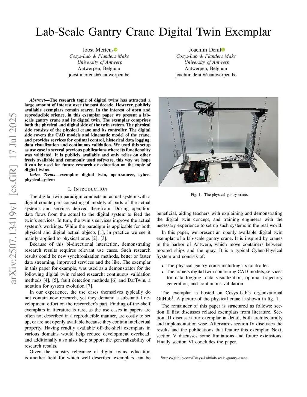 The research topic of digital twins has attracted a large amount of interest over the past decade. However, publicly available exemplars remain scarce. In the interest of open and reproducible science, in this exemplar paper we present a lab-scale gantry crane and its digital twin. The exemplar comprises both the physical and digital side of the twin system. The physical side consists of the physical crane and its controller. The digital side covers the CAD models and kinematic model of the crane, and provides services for optimal control, historical data logging, data visualization and continuous validation. We used this setup as use case in several previous publications where its functionality was validated. It is publicly available and only relies on other freely available and commonly used software, this way we hope it can be used for future research or education on the topic of digital twins.