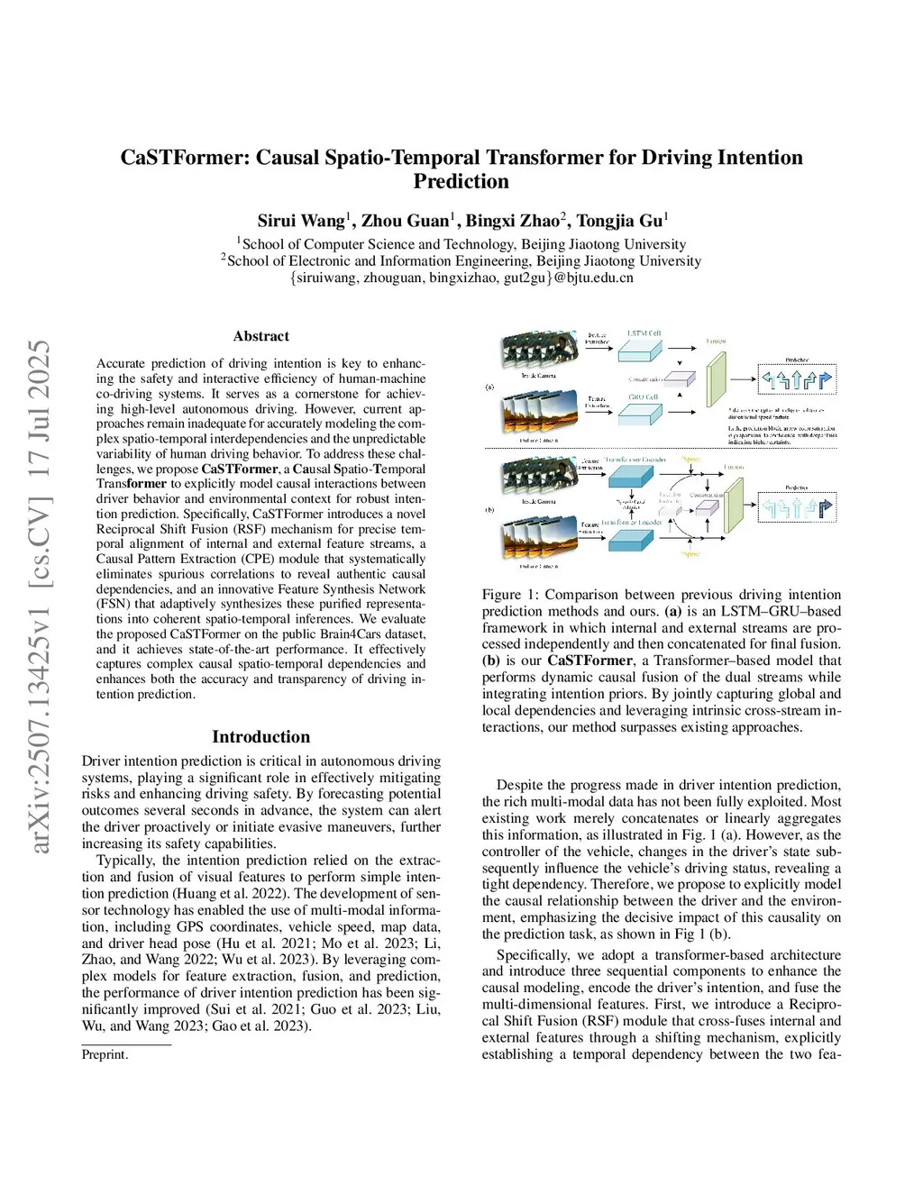 Accurate prediction of driving intention is key to enhancing the safety and interactive efficiency of human-machine co-driving systems. It serves as a cornerstone for achieving high-level autonomous driving. However, current approaches remain inadequate for accurately modeling the complex spatiotemporal interdependencies and the unpredictable variability of human driving behavior. To address these challenges, we propose CaTFormer, a causal Temporal Transformer that explicitly models causal interactions between driver behavior and environmental context for robust intention prediction. Specifically, CaTFormer introduces a novel Reciprocal Delayed Fusion (RDF) mechanism for precise temporal alignment of interior and exterior feature streams, a Counterfactual Residual Encoding (CRE) module that systematically eliminates spurious correlations to reveal authentic causal dependencies, and an innovative Feature Synthesis Network (FSN) that adaptively synthesizes these purified representations into coherent temporal representations. Experimental results demonstrate that CaTFormer attains state-of-the-art performance on the Brain4Cars dataset. It effectively captures complex causal temporal dependencies and enhances both the accuracy and transparency of driving intention prediction.
