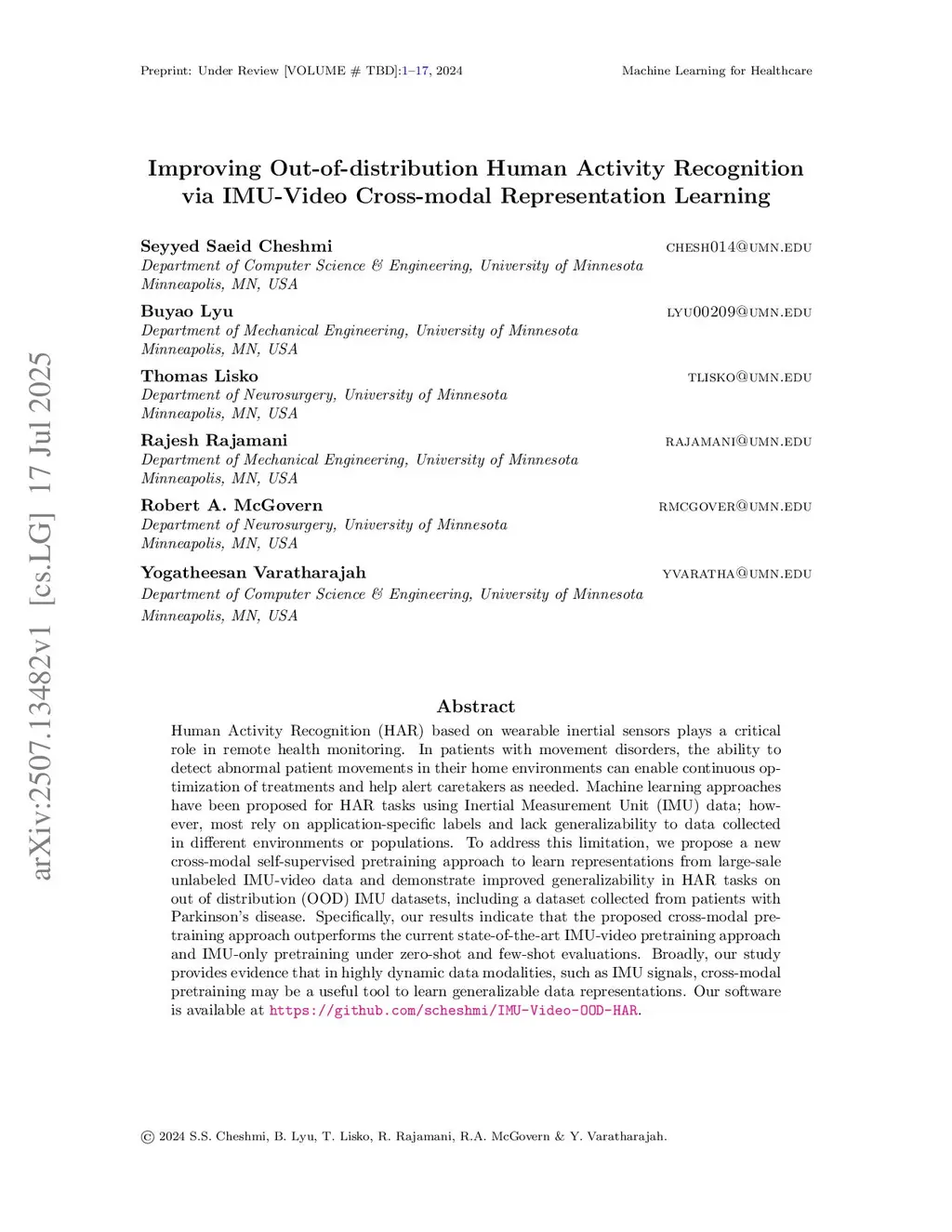 Human Activity Recognition (HAR) based on wearable inertial sensors plays a critical role in remote health monitoring. In patients with movement disorders, the ability to detect abnormal patient movements in their home environments can enable continuous optimization of treatments and help alert caretakers as needed. Machine learning approaches have been proposed for HAR tasks using Inertial Measurement Unit (IMU) data; however, most rely on application-specific labels and lack generalizability to data collected in different environments or populations. To address this limitation, we propose a new cross-modal self-supervised pretraining approach to learn representations from large-sale unlabeled IMU-video data and demonstrate improved generalizability in HAR tasks on out of distribution (OOD) IMU datasets, including a dataset collected from patients with Parkinson's disease. Specifically, our results indicate that the proposed cross-modal pretraining approach outperforms the current state-of-the-art IMU-video pretraining approach and IMU-only pretraining under zero-shot and few-shot evaluations. Broadly, our study provides evidence that in highly dynamic data modalities, such as IMU signals, cross-modal pretraining may be a useful tool to learn generalizable data representations. Our software is available atthis https URL.