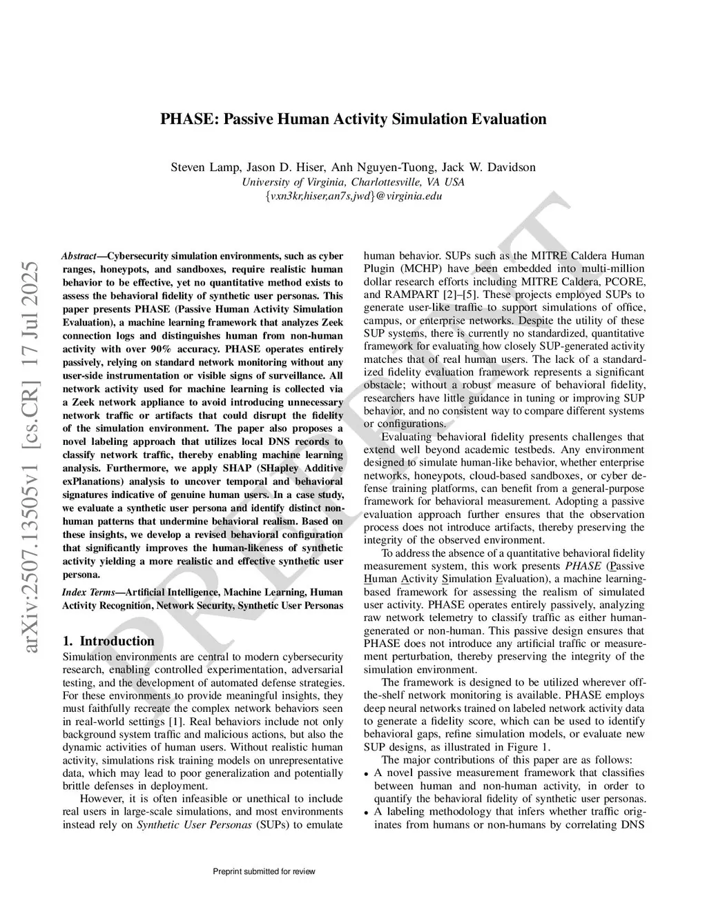 Cybersecurity simulation environments, such as cyber ranges, honeypots, and sandboxes, require realistic human behavior to be effective, yet no quantitative method exists to assess the behavioral fidelity of synthetic user personas. This paper presents PHASE (Passive Human Activity Simulation Evaluation), a machine learning framework that analyzes Zeek connection logs and distinguishes human from non-human activity with over 90\% accuracy. PHASE operates entirely passively, relying on standard network monitoring without any user-side instrumentation or visible signs of surveillance. All network activity used for machine learning is collected via a Zeek network appliance to avoid introducing unnecessary network traffic or artifacts that could disrupt the fidelity of the simulation environment. The paper also proposes a novel labeling approach that utilizes local DNS records to classify network traffic, thereby enabling machine learning analysis. Furthermore, we apply SHAP (SHapley Additive exPlanations) analysis to uncover temporal and behavioral signatures indicative of genuine human users. In a case study, we evaluate a synthetic user persona and identify distinct non-human patterns that undermine behavioral realism. Based on these insights, we develop a revised behavioral configuration that significantly improves the human-likeness of synthetic activity yielding a more realistic and effective synthetic user persona.