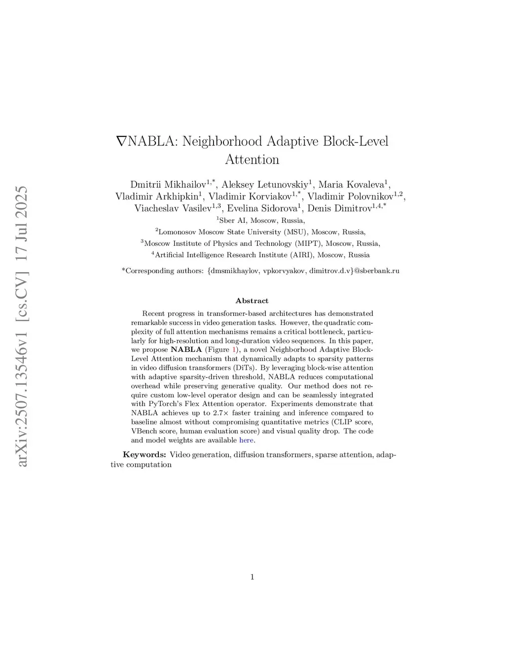 Recent progress in transformer-based architectures has demonstrated remarkable success in video generation tasks. However, the quadratic complexity of full attention mechanisms remains a critical bottleneck, particularly for high-resolution and long-duration video sequences. In this paper, we propose NABLA, a novel Neighborhood Adaptive Block-Level Attention mechanism that dynamically adapts to sparsity patterns in video diffusion transformers (DiTs). By leveraging block-wise attention with adaptive sparsity-driven threshold, NABLA reduces computational overhead while preserving generative quality. Our method does not require custom low-level operator design and can be seamlessly integrated with PyTorch's Flex Attention operator. Experiments demonstrate that NABLA achieves up to 2.7x faster training and inference compared to baseline almost without compromising quantitative metrics (CLIP score, VBench score, human evaluation score) and visual quality drop. The code and model weights are available here:this https URL