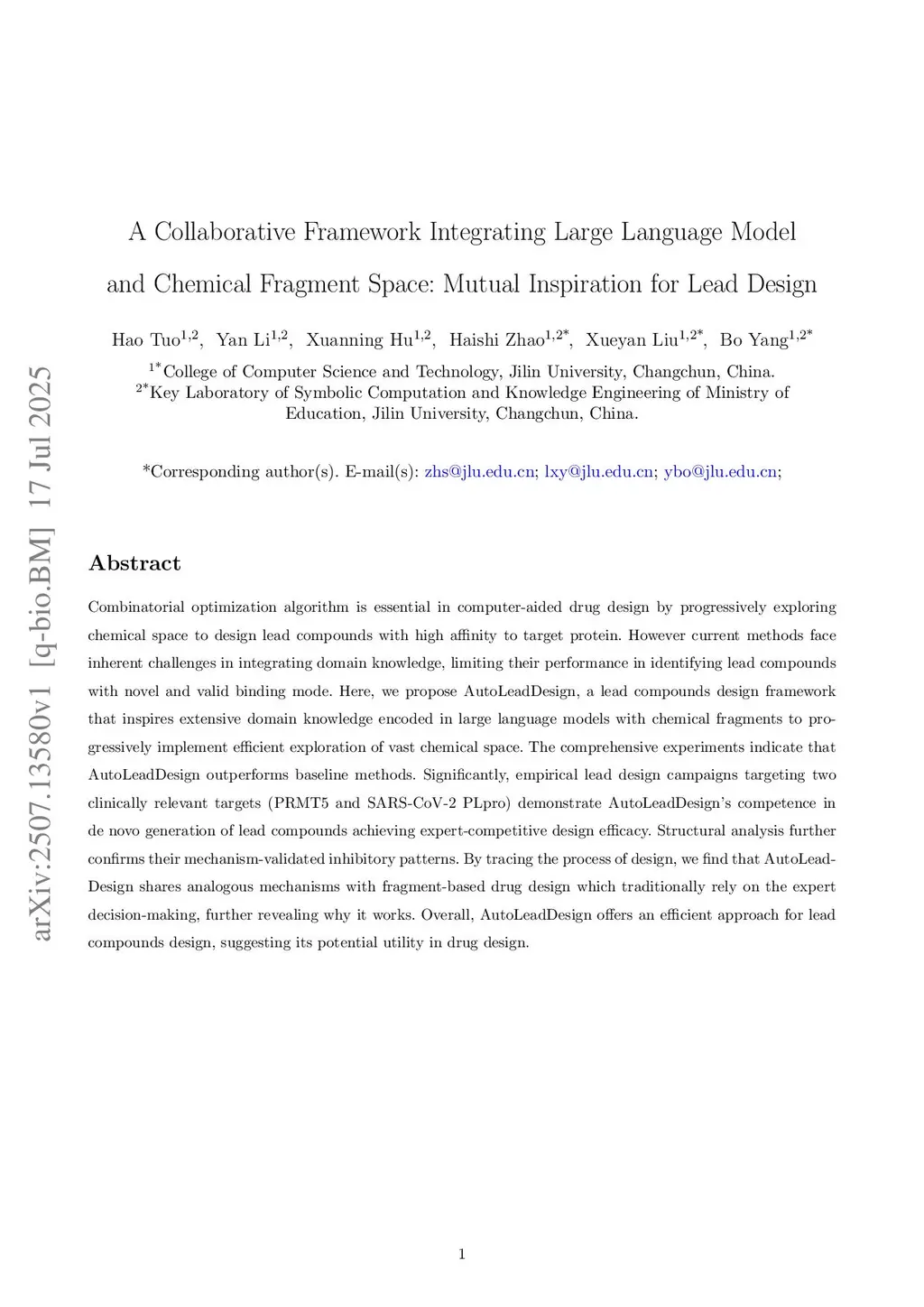 Combinatorial optimization algorithm is essential in computer-aided drug design by progressively exploring chemical space to design lead compounds with high affinity to target protein. However current methods face inherent challenges in integrating domain knowledge, limiting their performance in identifying lead compounds with novel and valid binding mode. Here, we propose AutoLeadDesign, a lead compounds design framework that inspires extensive domain knowledge encoded in large language models with chemical fragments to progressively implement efficient exploration of vast chemical space. The comprehensive experiments indicate that AutoLeadDesign outperforms baseline methods. Significantly, empirical lead design campaigns targeting two clinically relevant targets (PRMT5 and SARS-CoV-2 PLpro) demonstrate AutoLeadDesign's competence in de novo generation of lead compounds achieving expert-competitive design efficacy. Structural analysis further confirms their mechanism-validated inhibitory patterns. By tracing the process of design, we find that AutoLeadDesign shares analogous mechanisms with fragment-based drug design which traditionally rely on the expert decision-making, further revealing why it works. Overall, AutoLeadDesign offers an efficient approach for lead compounds design, suggesting its potential utility in drug design.
