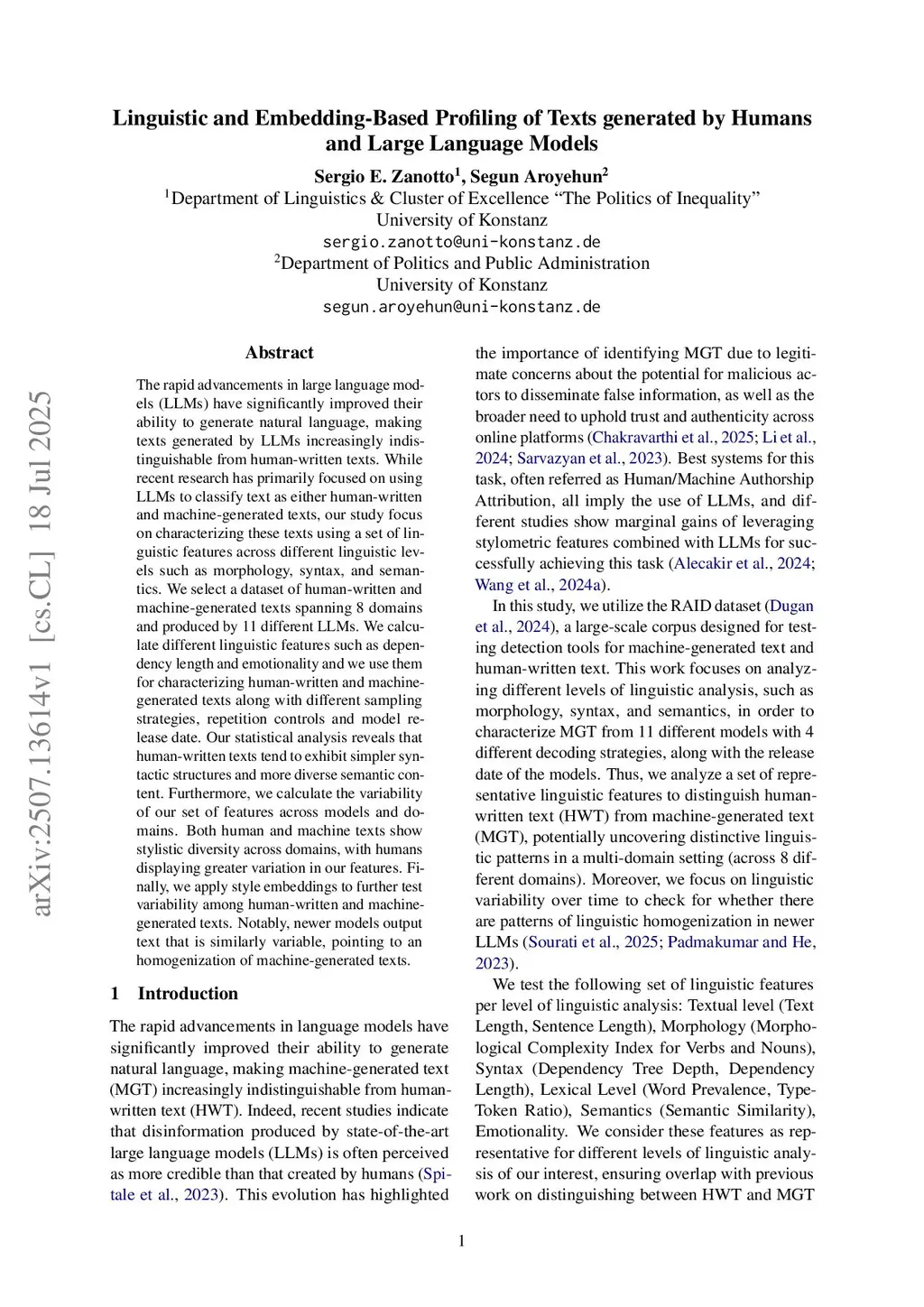 The rapid advancements in large language models (LLMs) have significantly improved their ability to generate natural language, making texts generated by LLMs increasingly indistinguishable from human-written texts. While recent research has primarily focused on using LLMs to classify text as either human-written and machine-generated texts, our study focus on characterizing these texts using a set of linguistic features across different linguistic levels such as morphology, syntax, and semantics. We select a dataset of human-written and machine-generated texts spanning 8 domains and produced by 11 different LLMs. We calculate different linguistic features such as dependency length and emotionality and we use them for characterizing human-written and machine-generated texts along with different sampling strategies, repetition controls and model release date. Our statistical analysis reveals that human-written texts tend to exhibit simpler syntactic structures and more diverse semantic content. Furthermore, we calculate the variability of our set of features across models and domains. Both human and machine texts show stylistic diversity across domains, with humans displaying greater variation in our features. Finally, we apply style embeddings to further test variability among human-written and machine-generated texts. Notably, newer models output text that is similarly variable, pointing to an homogenization of machine-generated texts.