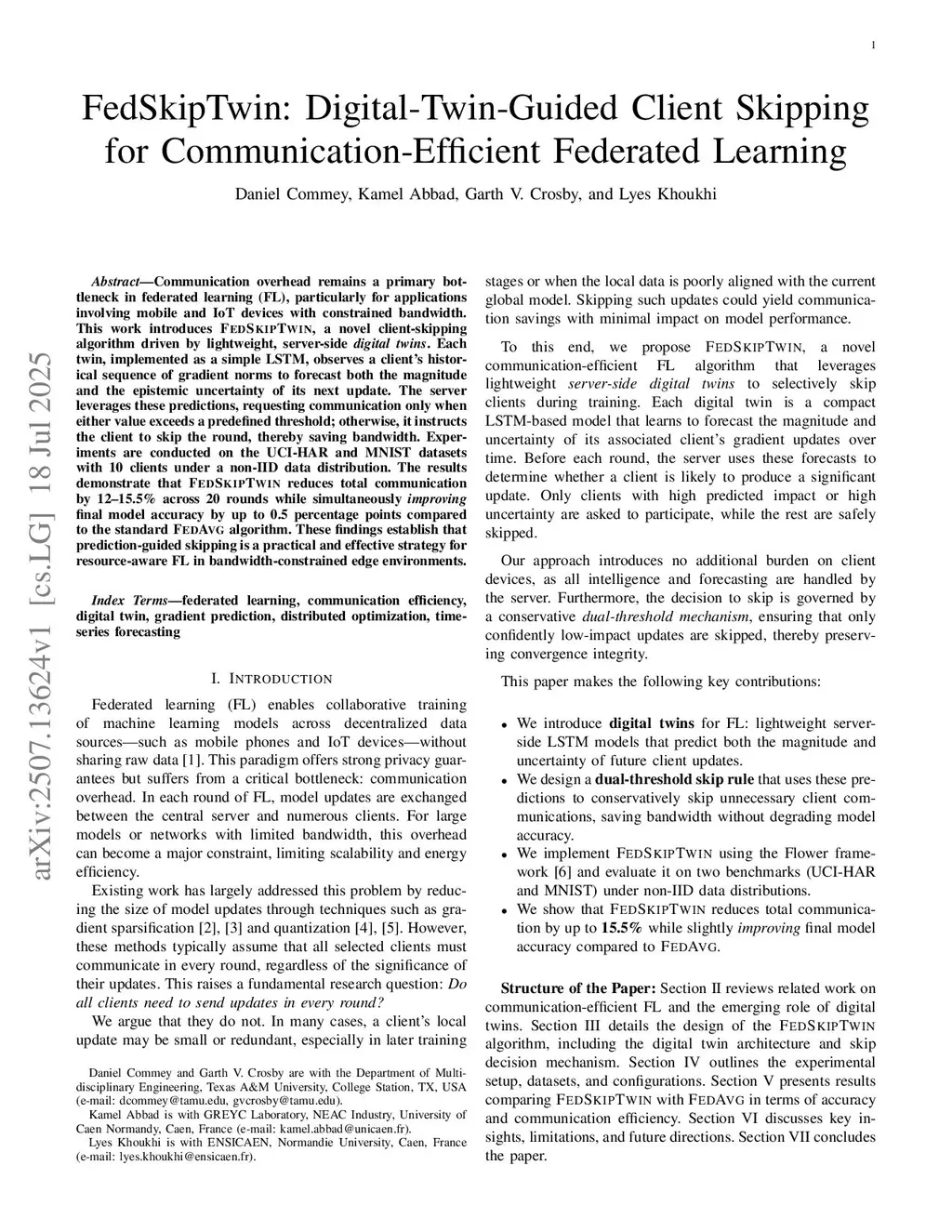 Communication overhead remains a primary bottleneck in federated learning (FL), particularly for applications involving mobile and IoT devices with constrained bandwidth. This work introduces FedSkipTwin, a novel client-skipping algorithm driven by lightweight, server-side digital twins. Each twin, implemented as a simple LSTM, observes a client's historical sequence of gradient norms to forecast both the magnitude and the epistemic uncertainty of its next update. The server leverages these predictions, requesting communication only when either value exceeds a predefined threshold; otherwise, it instructs the client to skip the round, thereby saving bandwidth. Experiments are conducted on the UCI-HAR and MNIST datasets with 10 clients under a non-IID data distribution. The results demonstrate that FedSkipTwin reduces total communication by 12-15.5% across 20 rounds while simultaneously improving final model accuracy by up to 0.5 percentage points compared to the standard FedAvg algorithm. These findings establish that prediction-guided skipping is a practical and effective strategy for resource-aware FL in bandwidth-constrained edge environments.
