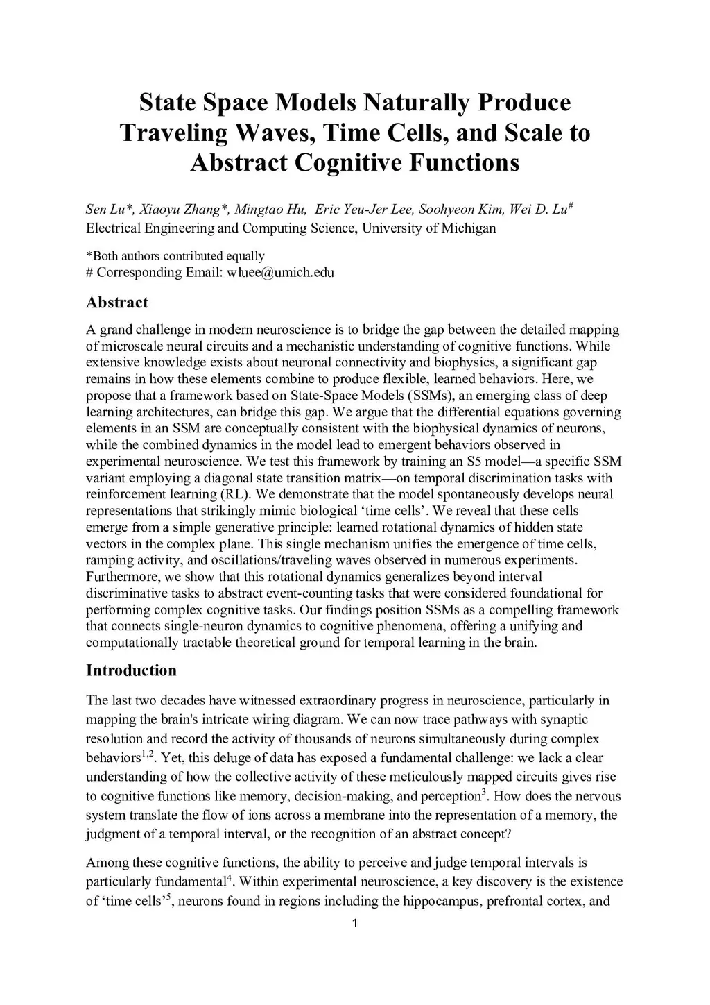 A grand challenge in modern neuroscience is to bridge the gap between the detailed mapping of microscale neural circuits and mechanistic understanding of cognitive functions. While extensive knowledge exists about neuronal connectivity and biophysics, how these low-level phenomena eventually produce abstract behaviors remains largely unresolved. Here, we propose that a model based on State Space Models, an emerging class of deep learning architectures, can be a potential biological model for analysis. We suggest that the differential equations governing elements in a State Space Model are conceptually consistent with the dynamics of biophysical processes, while the model offers a scalable framework to build on the dynamics to produce emergent behaviors observed in experimental neuroscience. We test this model by training a network employing a diagonal state transition matrix on temporal discrimination tasks with reinforcement learning. Our results suggest that neural behaviors such as time cells naturally emerge from two fundamental principles: optimal pre-configuration and rotational dynamics. These features are shown mathematically to optimize history compression, and naturally generate structured temporal dynamics even prior to training, mirroring recent findings in biological circuits. We show that learning acts primarily as a selection mechanism that fine-tunes these pre-configured oscillatory modes, rather than constructing temporal codes de novo. The model can be readily scaled to abstract cognitive functions such as event counting, supporting the use of State Space Models as a computationally tractable framework for understanding neural activities.
