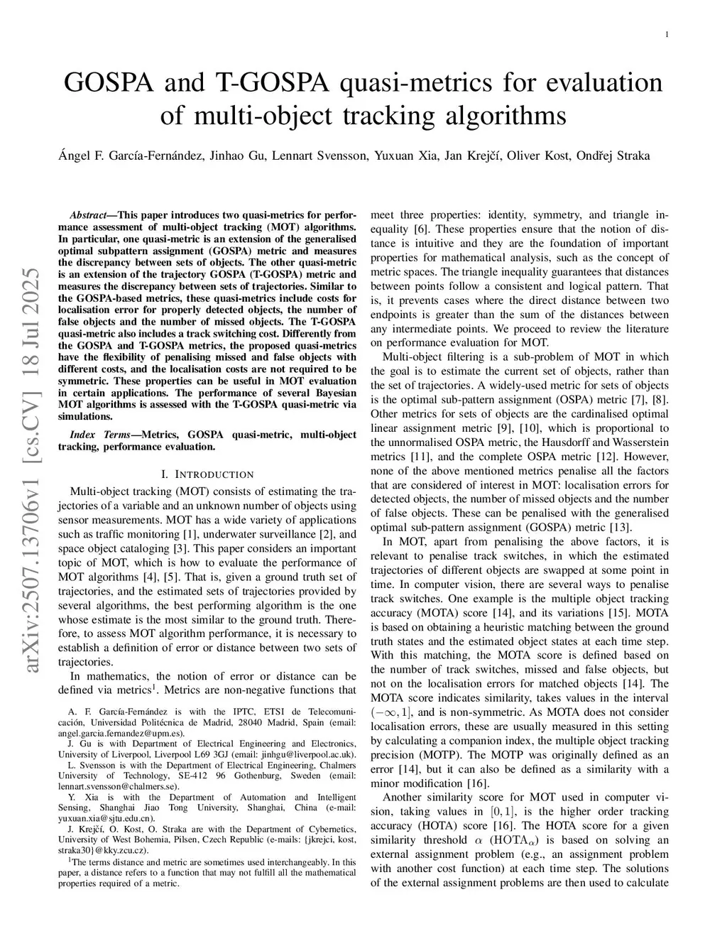 GOSPA and T-GOSPA quasi-metrics for evaluation of multi-object tracking algorithms