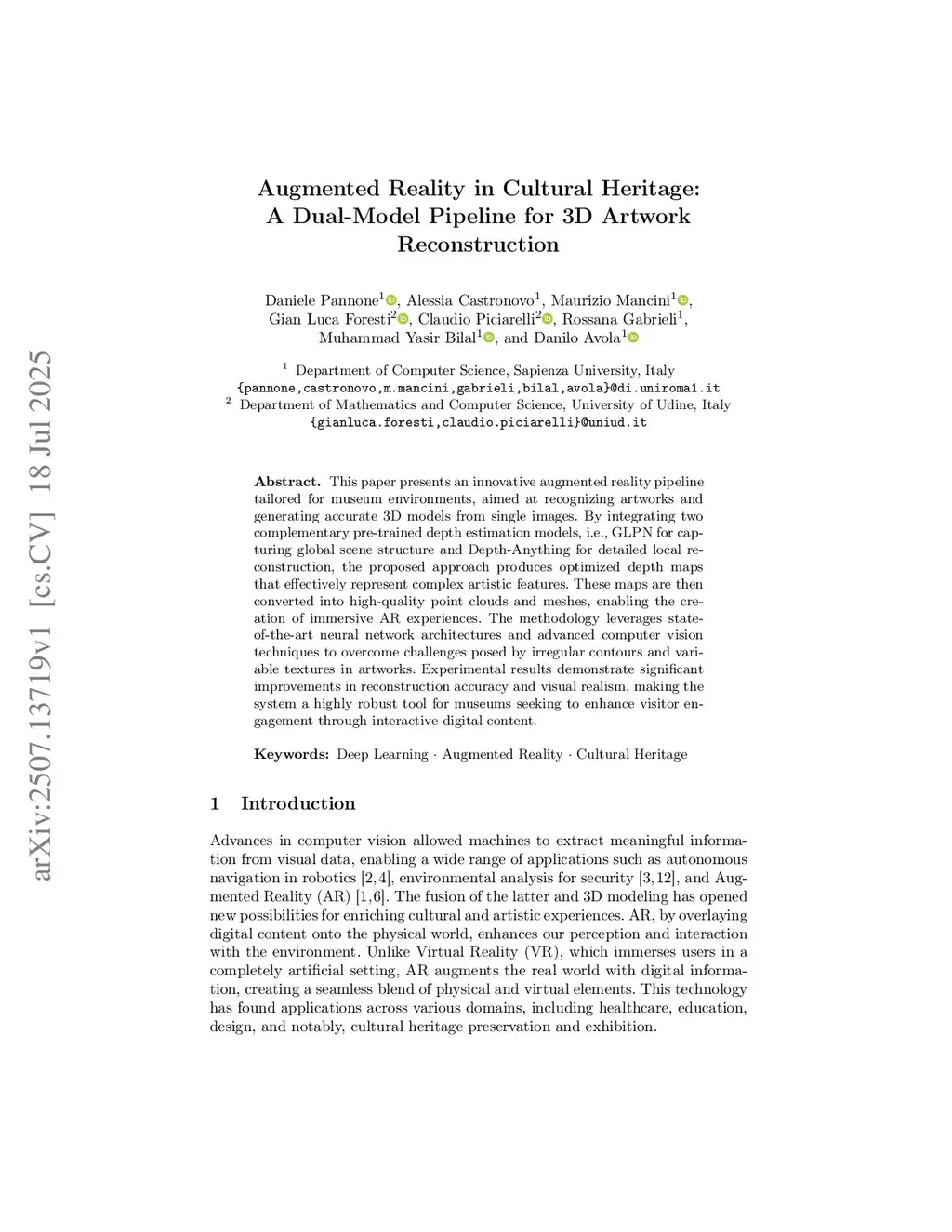 This paper presents an innovative augmented reality pipeline tailored for museum environments, aimed at recognizing artworks and generating accurate 3D models from single images. By integrating two complementary pre-trained depth estimation models, i.e., GLPN for capturing global scene structure and Depth-Anything for detailed local reconstruction, the proposed approach produces optimized depth maps that effectively represent complex artistic features. These maps are then converted into high-quality point clouds and meshes, enabling the creation of immersive AR experiences. The methodology leverages state-of-the-art neural network architectures and advanced computer vision techniques to overcome challenges posed by irregular contours and variable textures in artworks. Experimental results demonstrate significant improvements in reconstruction accuracy and visual realism, making the system a highly robust tool for museums seeking to enhance visitor engagement through interactive digital content.