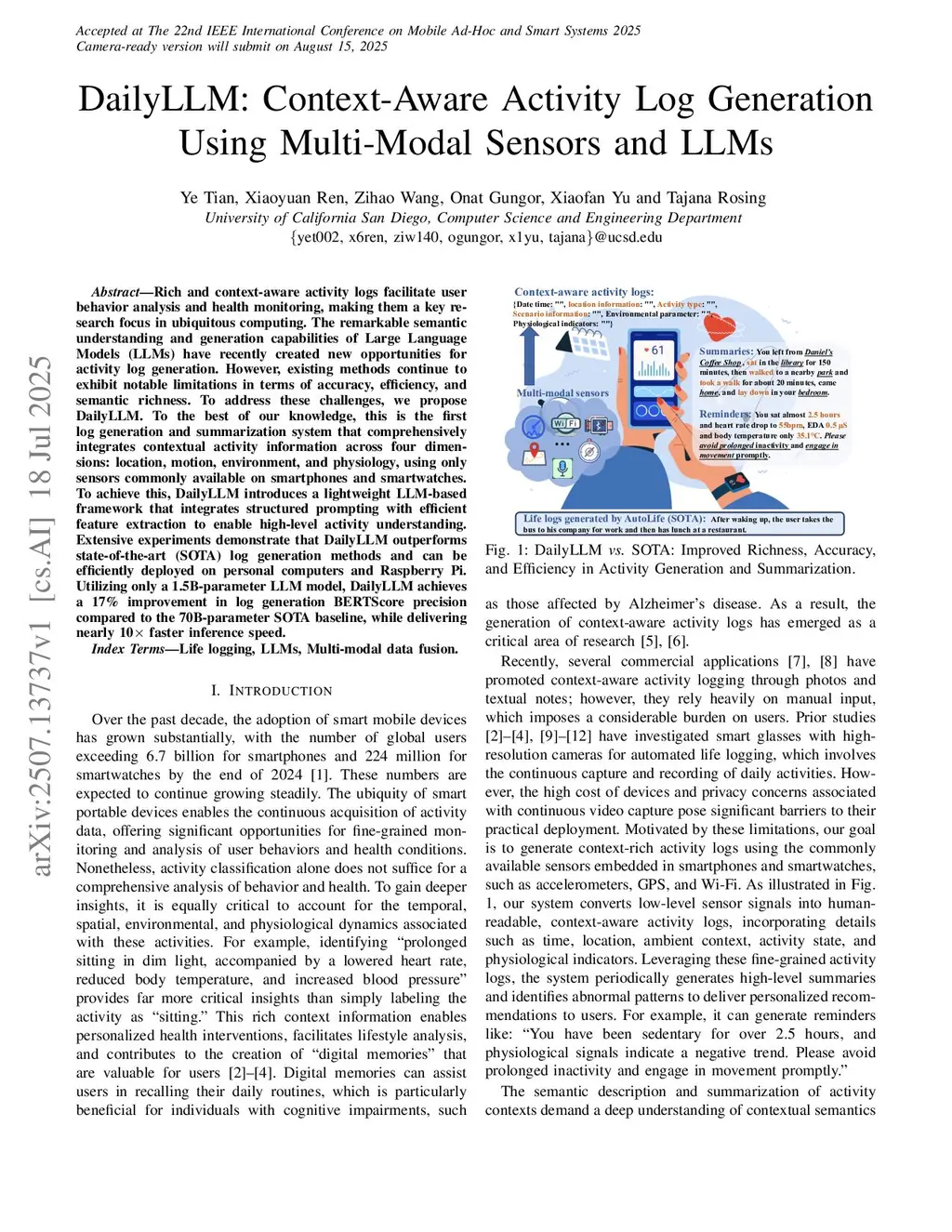 Rich and context-aware activity logs facilitate user behavior analysis and health monitoring, making them a key research focus in ubiquitous computing. The remarkable semantic understanding and generation capabilities of Large Language Models (LLMs) have recently created new opportunities for activity log generation. However, existing methods continue to exhibit notable limitations in terms of accuracy, efficiency, and semantic richness. To address these challenges, we propose DailyLLM. To the best of our knowledge, this is the first log generation and summarization system that comprehensively integrates contextual activity information across four dimensions: location, motion, environment, and physiology, using only sensors commonly available on smartphones and smartwatches. To achieve this, DailyLLM introduces a lightweight LLM-based framework that integrates structured prompting with efficient feature extraction to enable high-level activity understanding. Extensive experiments demonstrate that DailyLLM outperforms state-of-the-art (SOTA) log generation methods and can be efficiently deployed on personal computers and Raspberry Pi. Utilizing only a 1.5B-parameter LLM model, DailyLLM achieves a 17% improvement in log generation BERTScore precision compared to the 70B-parameter SOTA baseline, while delivering nearly 10x faster inference speed.