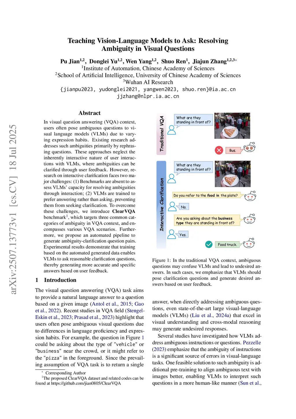 In visual question answering (VQA) context, users often pose ambiguous questions to visual language models (VLMs) due to varying expression habits. Existing research addresses such ambiguities primarily by rephrasing questions. These approaches neglect the inherently interactive nature of user interactions with VLMs, where ambiguities can be clarified through user feedback. However, research on interactive clarification faces two major challenges: (1) Benchmarks are absent to assess VLMs' capacity for resolving ambiguities through interaction; (2) VLMs are trained to prefer answering rather than asking, preventing them from seeking clarification. To overcome these challenges, we introduce \textbf{ClearVQA} benchmark, which targets three common categories of ambiguity in VQA context, and encompasses various VQA scenarios.
