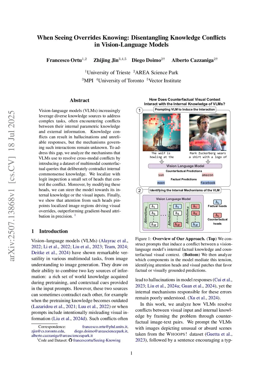 Vision-language models (VLMs) increasingly leverage diverse knowledge sources to address complex tasks, often encountering conflicts between their internal parametric knowledge and external information. Knowledge conflicts can result in hallucinations and unreliable responses, but the mechanisms governing such interactions remain unknown. To address this gap, we analyze the mechanisms that VLMs use to resolve cross-modal conflicts by introducing a dataset of multimodal counterfactual queries that deliberately contradict internal commonsense knowledge. We localize with logit inspection a small set of heads that control the conflict. Moreover, by modifying these heads, we can steer the model towards its internal knowledge or the visual inputs. Finally, we show that attention from such heads pinpoints localized image regions driving visual overrides, outperforming gradient-based attribution in precision.