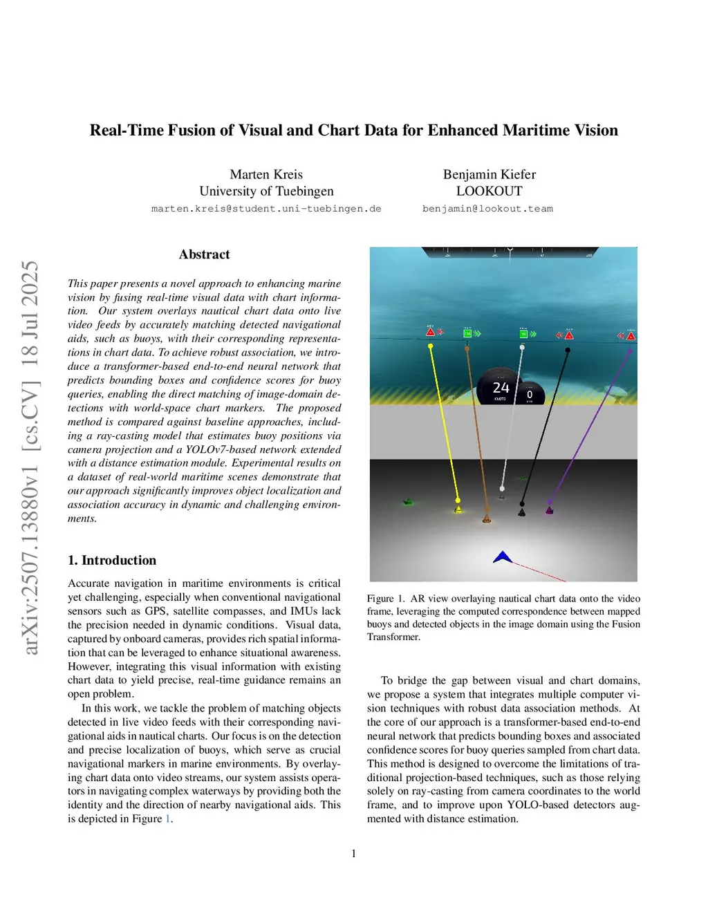 This paper presents a novel approach to enhancing marine vision by fusing real-time visual data with chart information. Our system overlays nautical chart data onto live video feeds by accurately matching detected navigational aids, such as buoys, with their corresponding representations in chart data. To achieve robust association, we introduce a transformer-based end-to-end neural network that predicts bounding boxes and confidence scores for buoy queries, enabling the direct matching of image-domain detections with world-space chart markers. The proposed method is compared against baseline approaches, including a ray-casting model that estimates buoy positions via camera projection and a YOLOv7-based network extended with a distance estimation module. Experimental results on a dataset of real-world maritime scenes demonstrate that our approach significantly improves object localization and association accuracy in dynamic and challenging environments.
