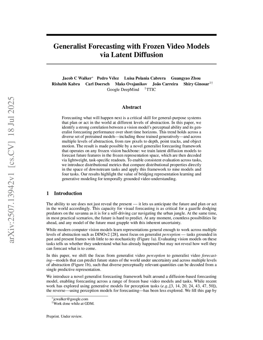 Forecasting what will happen next is a critical skill for general-purpose systems that plan or act in the world at different levels of abstraction. In this paper, we identify a strong correlation between a vision model's perceptual ability and its generalist forecasting performance over short time horizons. This trend holds across a diverse set of pretrained models-including those trained generatively-and across multiple levels of abstraction, from raw pixels to depth, point tracks, and object motion. The result is made possible by a novel generalist forecasting framework that operates on any frozen vision backbone: we train latent diffusion models to forecast future features in the frozen representation space, which are then decoded via lightweight, task-specific readouts. To enable consistent evaluation across tasks, we introduce distributional metrics that compare distributional properties directly in the space of downstream tasks and apply this framework to nine models and four tasks. Our results highlight the value of bridging representation learning and generative modeling for temporally grounded video understanding.