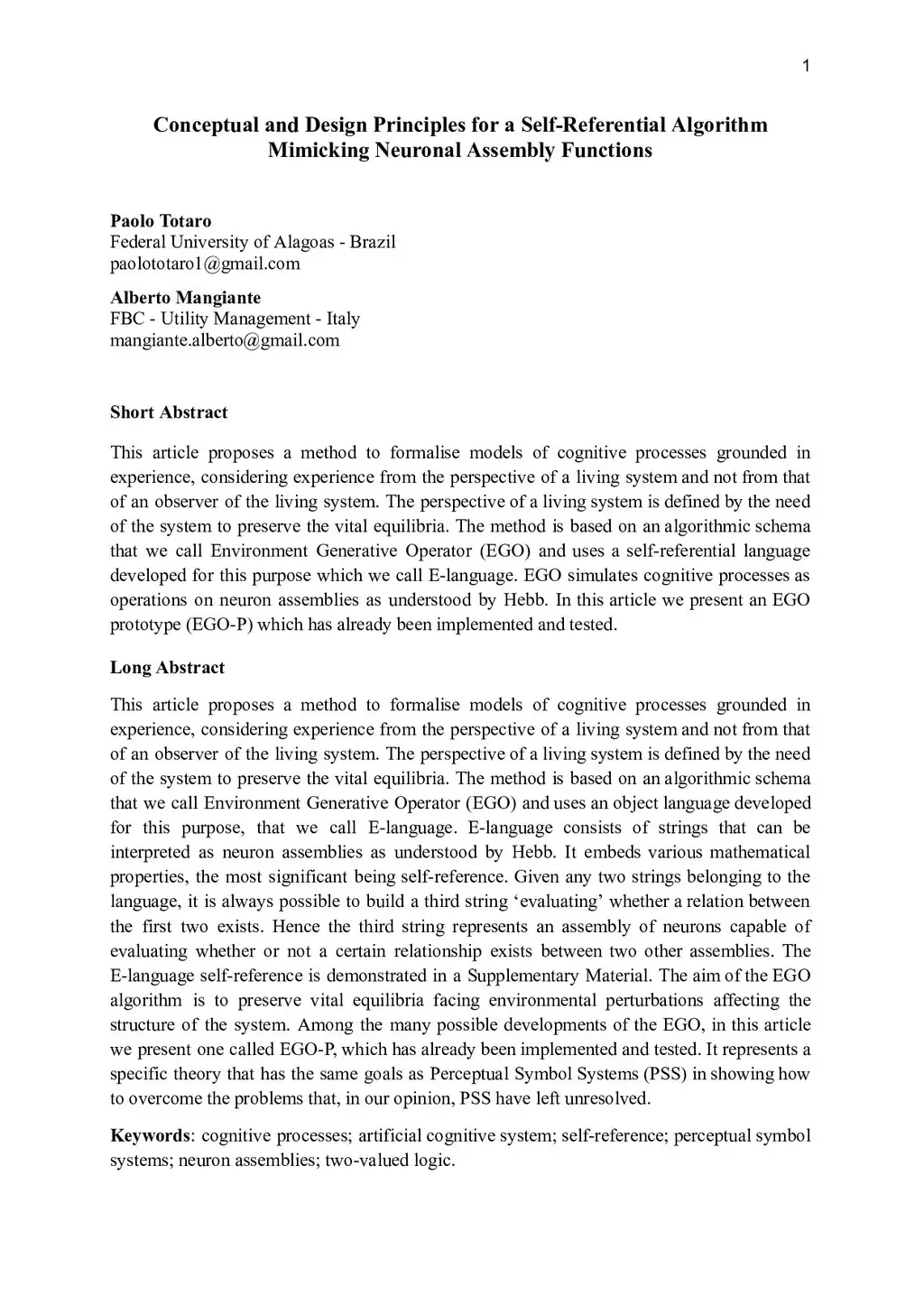 This article proposes a method to formalise models of cognitive processes grounded in experience, considering experience from the perspective of a living system and not from that of an observer of the living system. The perspective of a living system is defined by the need of the system to preserve the vital equilibria. The method is based on an algorithmic schema that we call Environment Generative Operator (EGO) and uses a self-referential language developed for this purpose which we call E-language. EGO simulates cognitive processes as operations on neuron assemblies as understood by Hebb. In this article we present an EGO prototype (EGO-P) which has already been implemented and tested.