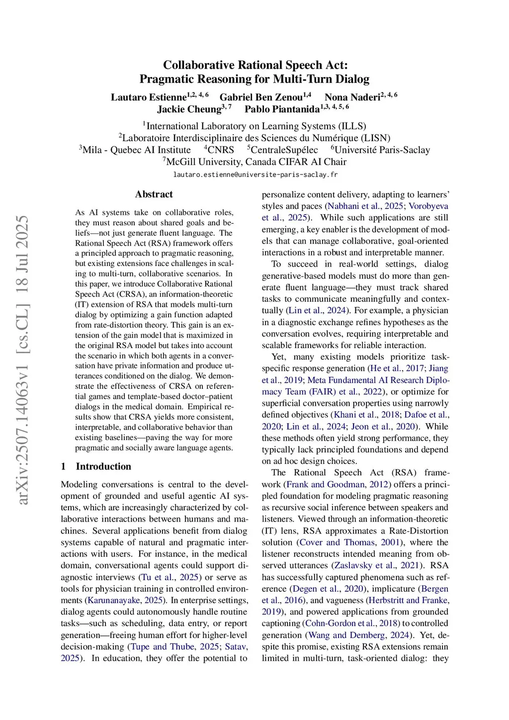 As AI systems take on collaborative roles, they must reason about shared goals and beliefs-not just generate fluent language. The Rational Speech Act (RSA) framework offers a principled approach to pragmatic reasoning, but existing extensions face challenges in scaling to multi-turn, collaborative scenarios. In this paper, we introduce Collaborative Rational Speech Act (CRSA), an information-theoretic (IT) extension of RSA that models multi-turn dialog by optimizing a gain function adapted from rate-distortion theory. This gain is an extension of the gain model that is maximized in the original RSA model but takes into account the scenario in which both agents in a conversation have private information and produce utterances conditioned on the dialog. We demonstrate the effectiveness of CRSA on referential games and template-based doctor-patient dialogs in the medical domain. Empirical results show that CRSA yields more consistent, interpretable, and collaborative behavior than existing baselines-paving the way for more pragmatic and socially aware language agents.