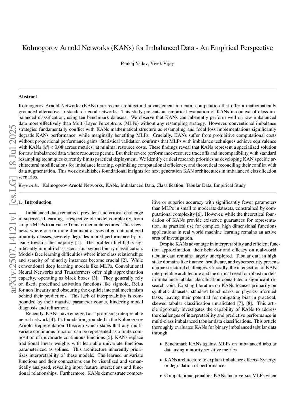 Kolmogorov Arnold Networks (KANs) are recent architectural advancement in neural computation that offer a mathematically grounded alternative to standard neural networks. This study presents an empirical evaluation of KANs in context of class imbalanced classification, using ten benchmark datasets. We observe that KANs can inherently perform well on raw imbalanced data more effectively than Multi-Layer Perceptrons (MLPs) without any resampling strategy. However, conventional imbalance strategies fundamentally conflict with KANs mathematical structure as resampling and focal loss implementations significantly degrade KANs performance, while marginally benefiting MLPs. Crucially, KANs suffer from prohibitive computational costs without proportional performance gains. Statistical validation confirms that MLPs with imbalance techniques achieve equivalence with KANs (|d| < 0.08 across metrics) at minimal resource costs. These findings reveal that KANs represent a specialized solution for raw imbalanced data where resources permit. But their severe performance-resource tradeoffs and incompatibility with standard resampling techniques currently limits practical deployment. We identify critical research priorities as developing KAN specific architectural modifications for imbalance learning, optimizing computational efficiency, and theoretical reconciling their conflict with data augmentation. This work establishes foundational insights for next generation KAN architectures in imbalanced classification scenarios.