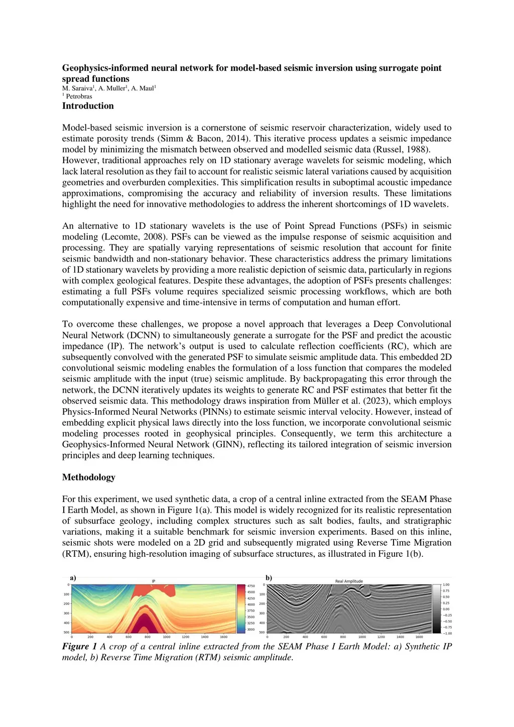 Model-based seismic inversion is a key technique in reservoir characterization, but traditional methods face significant limitations, such as relying on 1D average stationary wavelets and assuming an unrealistic lateral resolution. To address these challenges, we propose a Geophysics-Informed Neural Network (GINN) that integrates deep learning with seismic modeling. This novel approach employs a Deep Convolutional Neural Network (DCNN) to simultaneously estimate Point Spread Functions (PSFs) and acoustic impedance (IP). PSFs are divided into zero-phase and residual components to ensure geophysical consistency and to capture fine details. We used synthetic data from the SEAM Phase I Earth Model to train the GINN for 100 epochs (approximately 20 minutes) using a 2D UNet architecture. The network's inputs include positional features and a low-frequency impedance (LF-IP) model. A self-supervised loss function combining Mean Squared Error (MSE) and Structural Similarity Index Measure (SSIM) was employed to ensure accurate results. The GINN demonstrated its ability to generate high-resolution IP and realistic PSFs, aligning with expected geological features. Unlike traditional 1D wavelets, the GINN produces PSFs with limited lateral resolution, reducing noise and improving accuracy. Future work will aim to refine the training process and validate the methodology with real seismic data.