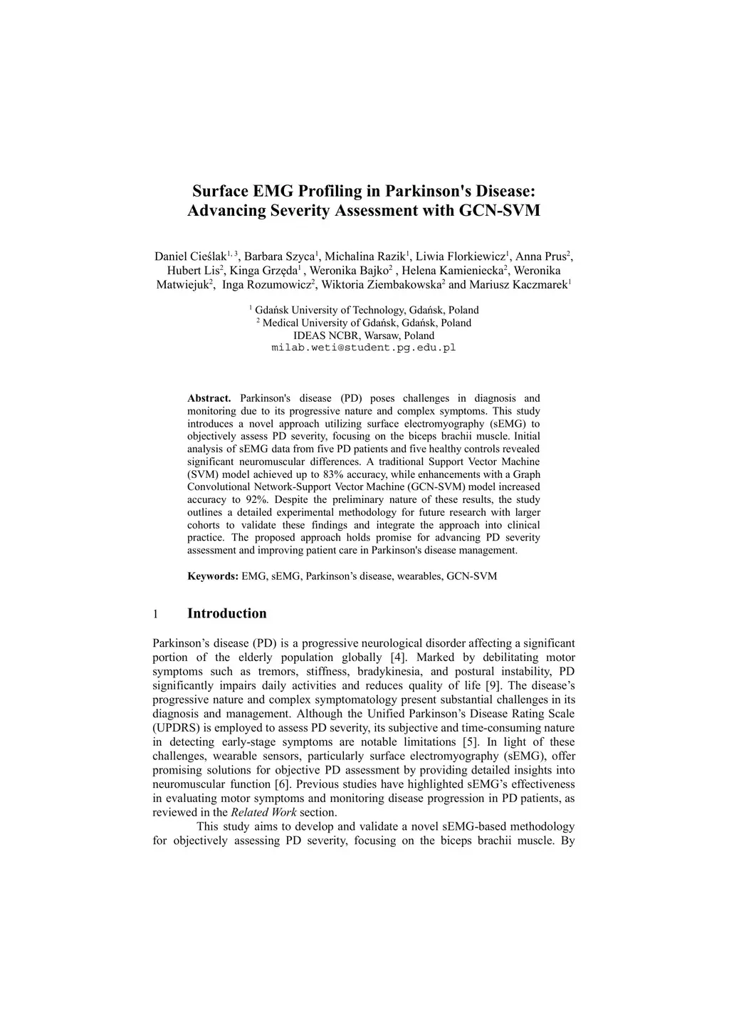 Parkinson's disease (PD) poses challenges in diagnosis and monitoring due to its progressive nature and complex symptoms. This study introduces a novel approach utilizing surface electromyography (sEMG) to objectively assess PD severity, focusing on the biceps brachii muscle. Initial analysis of sEMG data from five PD patients and five healthy controls revealed significant neuromuscular differences. A traditional Support Vector Machine (SVM) model achieved up to 83% accuracy, while enhancements with a Graph Convolutional Network-Support Vector Machine (GCN-SVM) model increased accuracy to 92%. Despite the preliminary nature of these results, the study outlines a detailed experimental methodology for future research with larger cohorts to validate these findings and integrate the approach into clinical practice. The proposed approach holds promise for advancing PD severity assessment and improving patient care in Parkinson's disease management.