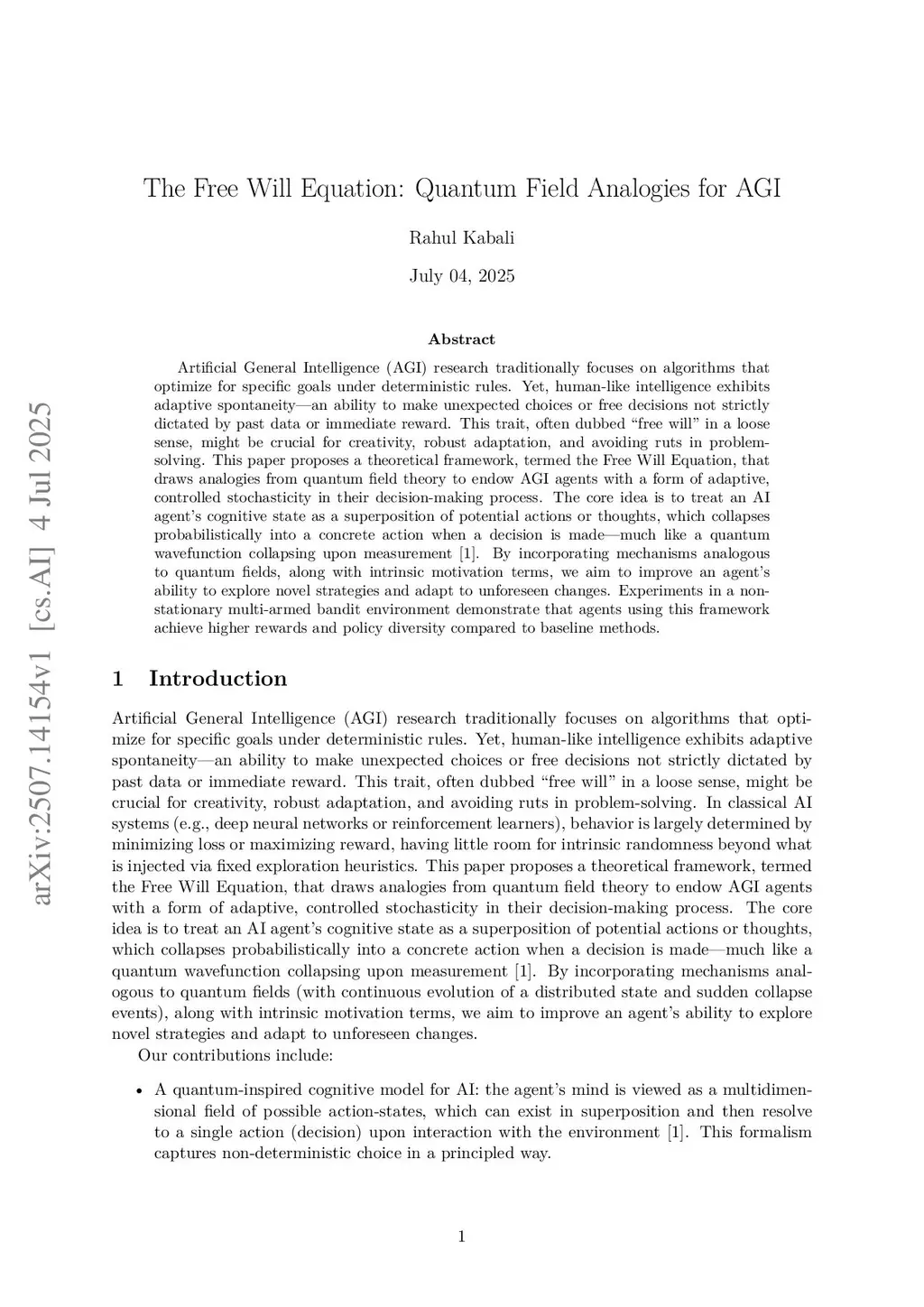 Artificial General Intelligence (AGI) research traditionally focuses on algorithms that optimize for specific goals under deterministic rules. Yet, human-like intelligence exhibits adaptive spontaneity - an ability to make unexpected choices or free decisions not strictly dictated by past data or immediate reward. This trait, often dubbed "free will" in a loose sense, might be crucial for creativity, robust adaptation, and avoiding ruts in problem-solving. This paper proposes a theoretical framework, called the Free Will Equation, that draws analogies from quantum field theory to endow AGI agents with a form of adaptive, controlled stochasticity in their decision-making process. The core idea is to treat an AI agent's cognitive state as a superposition of potential actions or thoughts, which collapses probabilistically into a concrete action when a decision is made - much like a quantum wavefunction collapsing upon measurement. By incorporating mechanisms analogous to quantum fields, along with intrinsic motivation terms, we aim to improve an agent's ability to explore novel strategies and adapt to unforeseen changes. Experiments in a non-stationary multi-armed bandit environment demonstrate that agents using this framework achieve higher rewards and policy diversity compared to baseline methods.