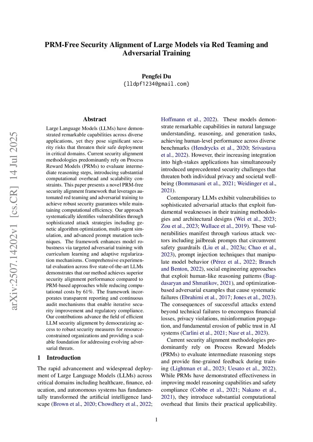 Large Language Models (LLMs) have demonstrated remarkable capabilities across diverse applications, yet they pose significant security risks that threaten their safe deployment in critical domains. Current security alignment methodologies predominantly rely on Process Reward Models (PRMs) to evaluate intermediate reasoning steps, introducing substantial computational overhead and scalability constraints. This paper presents a novel PRM-free security alignment framework that leverages automated red teaming and adversarial training to achieve robust security guarantees while maintaining computational efficiency. Our approach systematically identifies vulnerabilities through sophisticated attack strategies including genetic algorithm optimization, multi-agent simulation, and advanced prompt mutation techniques. The framework enhances model robustness via targeted adversarial training with curriculum learning and adaptive regularization mechanisms. Comprehensive experimental evaluation across five state-of-the-art LLMs demonstrates that our method achieves superior security alignment performance compared to PRM-based approaches while reducing computational costs by 61\%. The framework incorporates transparent reporting and continuous audit mechanisms that enable iterative security improvement and regulatory compliance. Our contributions advance the field of efficient LLM security alignment by democratizing access to robust security measures for resource-constrained organizations and providing a scalable foundation for addressing evolving adversarial threats.