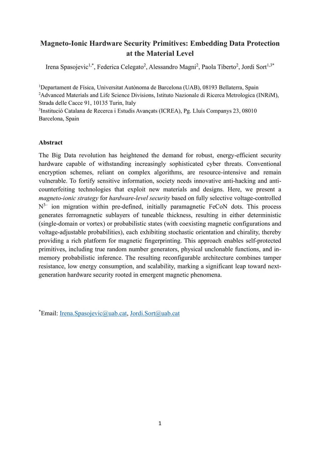 The Big Data revolution has heightened the demand for robust, energy-efficient security hardware capable of withstanding increasingly sophisticated cyber threats. Conventional encryption schemes, reliant on complex algorithms, are resource-intensive and remain vulnerable. To fortify sensitive information, society needs innovative anti-hacking and anti-counterfeiting technologies that exploit new materials and designs. Here, we present a magneto-ionic strategy for hardware-level security based on fully selective voltage-controlled N3- ion migration within pre-defined, initially paramagnetic FeCoN dots. This process generates ferromagnetic sublayers of tuneable thickness, resulting in either deterministic (single-domain or vortex) or probabilistic states (with coexisting magnetic configurations and voltage-adjustable probabilities), each exhibiting stochastic orientation and chirality, thereby providing a rich platform for magnetic fingerprinting. This approach enables self-protected primitives, including true random number generators, physical unclonable functions, and in-memory probabilistic inference. The resulting reconfigurable architecture combines tamper resistance, low energy consumption, and scalability, marking a significant leap toward next-generation hardware security rooted in emergent magnetic phenomena.