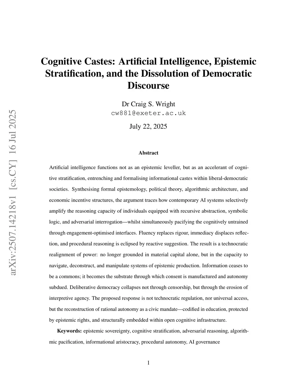 Artificial intelligence functions not as an epistemic leveller, but as an accelerant of cognitive stratification, entrenching and formalising informational castes within liberal-democratic societies. Synthesising formal epistemology, political theory, algorithmic architecture, and economic incentive structures, the argument traces how contemporary AI systems selectively amplify the reasoning capacity of individuals equipped with recursive abstraction, symbolic logic, and adversarial interrogation, whilst simultaneously pacifying the cognitively untrained through engagement-optimised interfaces. Fluency replaces rigour, immediacy displaces reflection, and procedural reasoning is eclipsed by reactive suggestion. The result is a technocratic realignment of power: no longer grounded in material capital alone, but in the capacity to navigate, deconstruct, and manipulate systems of epistemic production. Information ceases to be a commons; it becomes the substrate through which consent is manufactured and autonomy subdued. Deliberative democracy collapses not through censorship, but through the erosion of interpretive agency. The proposed response is not technocratic regulation, nor universal access, but the reconstruction of rational autonomy as a civic mandate, codified in education, protected by epistemic rights, and structurally embedded within open cognitive infrastructure.