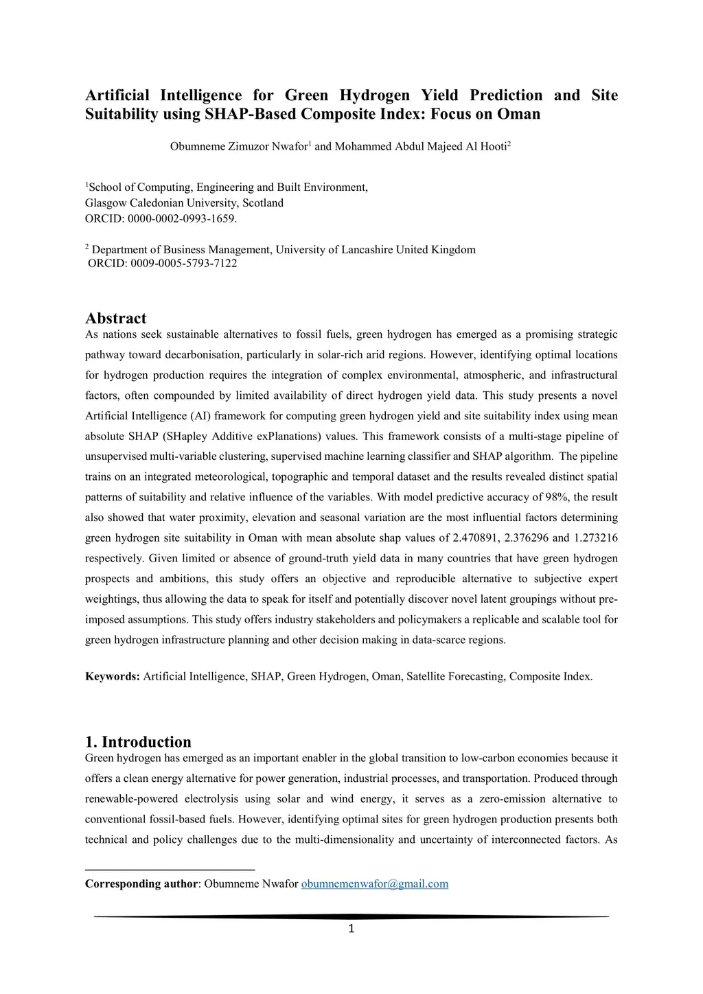 As nations seek sustainable alternatives to fossil fuels, green hydrogen has emerged as a promising strategic pathway toward decarbonisation, particularly in solar-rich arid regions. However, identifying optimal locations for hydrogen production requires the integration of complex environmental, atmospheric, and infrastructural factors, often compounded by limited availability of direct hydrogen yield data. This study presents a novel Artificial Intelligence (AI) framework for computing green hydrogen yield and site suitability index using mean absolute SHAP (SHapley Additive exPlanations) values. This framework consists of a multi-stage pipeline of unsupervised multi-variable clustering, supervised machine learning classifier and SHAP algorithm. The pipeline trains on an integrated meteorological, topographic and temporal dataset and the results revealed distinct spatial patterns of suitability and relative influence of the variables. With model predictive accuracy of 98%, the result also showed that water proximity, elevation and seasonal variation are the most influential factors determining green hydrogen site suitability in Oman with mean absolute shap values of 2.470891, 2.376296 and 1.273216 respectively. Given limited or absence of ground-truth yield data in many countries that have green hydrogen prospects and ambitions, this study offers an objective and reproducible alternative to subjective expert weightings, thus allowing the data to speak for itself and potentially discover novel latent groupings without pre-imposed assumptions. This study offers industry stakeholders and policymakers a replicable and scalable tool for green hydrogen infrastructure planning and other decision making in data-scarce regions.