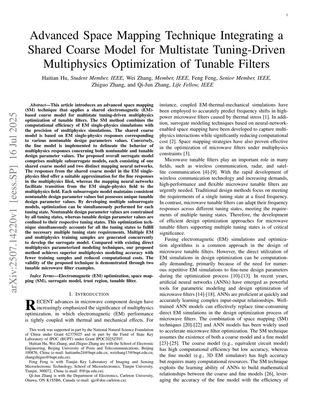 This article introduces an advanced space mapping (SM) technique that applies a shared electromagnetic (EM)-based coarse model for multistate tuning-driven multiphysics optimization of tunable filters. The SM method combines the computational efficiency of EM single-physics simulations with the precision of multiphysics simulations. The shared coarse model is based on EM single-physics responses corresponding to various nontunable design parameters values. Conversely, the fine model is implemented to delineate the behavior of multiphysics responses concerning both nontunable and tunable design parameter values. The proposed overall surrogate model comprises multiple subsurrogate models, each consisting of one shared coarse model and two distinct mapping neural networks. The responses from the shared coarse model in the EM single-physics filed offer a suitable approximation for the fine responses in the multiphysics filed, whereas the mapping neural networks facilitate transition from the EM single-physics field to the multiphysics field. Each subsurrogate model maintains consistent nontunable design parameter values but possesses unique tunable design parameter values. By developing multiple subsurrogate models, optimization can be simultaneously performed for each tuning state. Nontunable design parameter values are constrained by all tuning states, whereas tunable design parameter values are confined to their respective tuning states. This optimization technique simultaneously accounts for all the tuning states to fulfill the necessary multiple tuning state requirements. Multiple EM and multiphysics training samples are generated concurrently to develop the surrogate model. Compared with existing direct multiphysics parameterized modeling techniques, our proposed method achieves superior multiphysics modeling accuracy with fewer training samples and reduced computational costs.