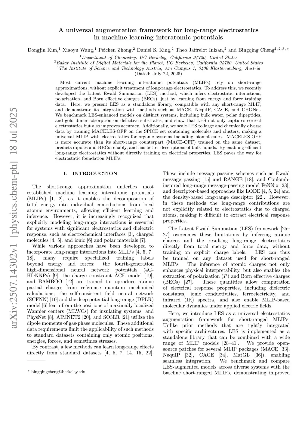 Most current machine learning interatomic potentials (MLIPs) rely on short-range approximations, without explicit treatment of long-range electrostatics. To address this, we recently developed the Latent Ewald Summation (LES) method, which infers electrostatic interactions, polarization, and Born effective charges (BECs), just by learning from energy and force training data. Here, we present LES as a standalone library, compatible with any short-range MLIP, and demonstrate its integration with methods such as MACE, NequIP, CACE, and CHGNet. We benchmark LES-enhanced models on distinct systems, including bulk water, polar dipeptides, and gold dimer adsorption on defective substrates, and show that LES not only captures correct electrostatics but also improves accuracy. Additionally, we scale LES to large and chemically diverse data by training MACELES-OFF on the SPICE set containing molecules and clusters, making a universal MLIP with electrostatics for organic systems including biomolecules. MACELES-OFF is more accurate than its short-range counterpart (MACE-OFF) trained on the same dataset, predicts dipoles and BECs reliably, and has better descriptions of bulk liquids. By enabling efficient long-range electrostatics without directly training on electrical properties, LES paves the way for electrostatic foundation MLIPs.