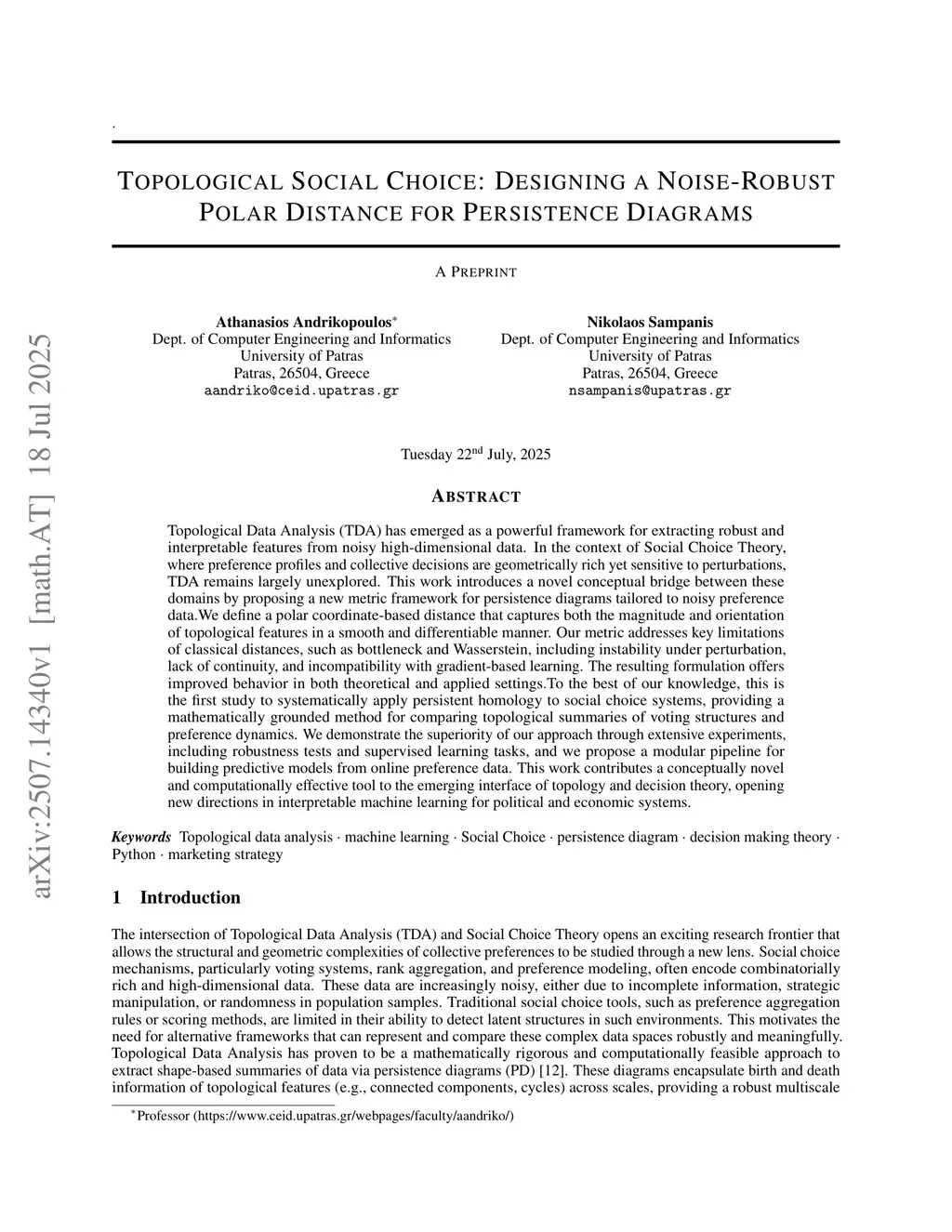 Topological Data Analysis (TDA) has emerged as a powerful framework for extracting robust and interpretable features from noisy high-dimensional data. In the context of Social Choice Theory, where preference profiles and collective decisions are geometrically rich yet sensitive to perturbations, TDA remains largely unexplored. This work introduces a novel conceptual bridge between these domains by proposing a new metric framework for persistence diagrams tailored to noisy preferencethis http URLdefine a polar coordinate-based distance that captures both the magnitude and orientation of topological features in a smooth and differentiable manner. Our metric addresses key limitations of classical distances, such as bottleneck and Wasserstein, including instability under perturbation, lack of continuity, and incompatibility with gradient-based learning. The resulting formulation offers improved behavior in both theoretical and appliedthis http URLthe best of our knowledge, this is the first study to systematically apply persistent homology to social choice systems, providing a mathematically grounded method for comparing topological summaries of voting structures and preference dynamics. We demonstrate the superiority of our approach through extensive experiments, including robustness tests and supervised learning tasks, and we propose a modular pipeline for building predictive models from online preference data. This work contributes a conceptually novel and computationally effective tool to the emerging interface of topology and decision theory, opening new directions in interpretable machine learning for political and economic systems.