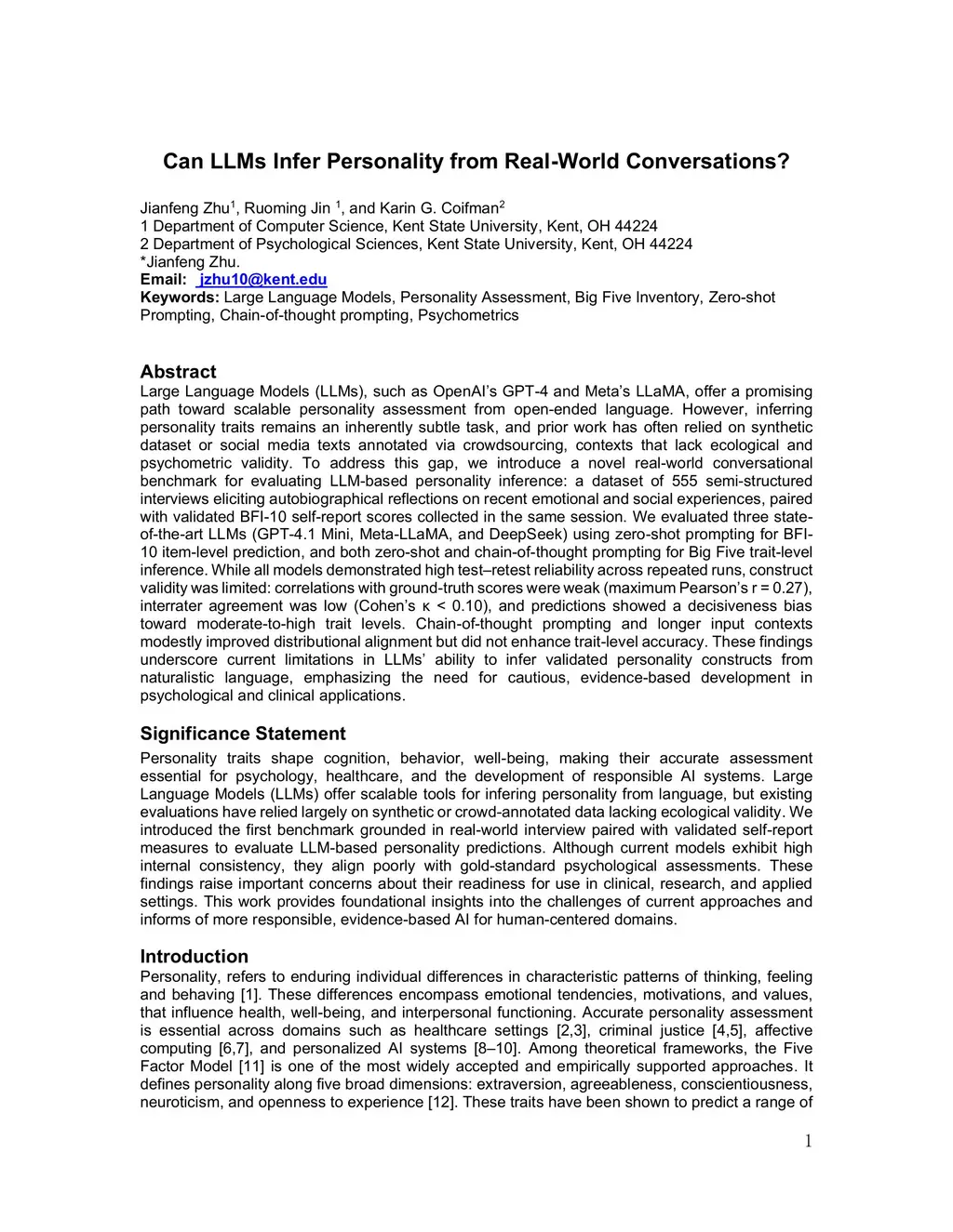 Large Language Models (LLMs) such as OpenAI's GPT-4 and Meta's LLaMA offer a promising approach for scalable personality assessment from open-ended language. However, inferring personality traits remains challenging, and earlier work often relied on synthetic data or social media text lacking psychometric validity. We introduce a real-world benchmark of 555 semi-structured interviews with BFI-10 self-report scores for evaluating LLM-based personality inference. Three state-of-the-art LLMs (GPT-4.1 Mini, Meta-LLaMA, and DeepSeek) were tested using zero-shot prompting for BFI-10 item prediction and both zero-shot and chain-of-thought prompting for Big Five trait inference. All models showed high test-retest reliability, but construct validity was limited: correlations with ground-truth scores were weak (max Pearson's ), interrater agreement was low (Cohen's ), and predictions were biased toward moderate or high trait levels. Chain-of-thought prompting and longer input context modestly improved distributional alignment, but not trait-level accuracy. These results underscore limitations in current LLM-based personality inference and highlight the need for evidence-based development for psychological applications.