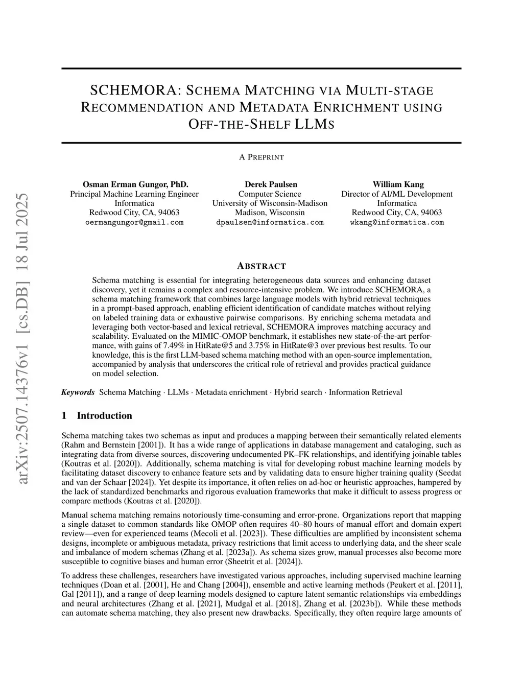 Schemora: schema matching via multi-stage recommendation and metadata enrichment using off-the-shelf llms