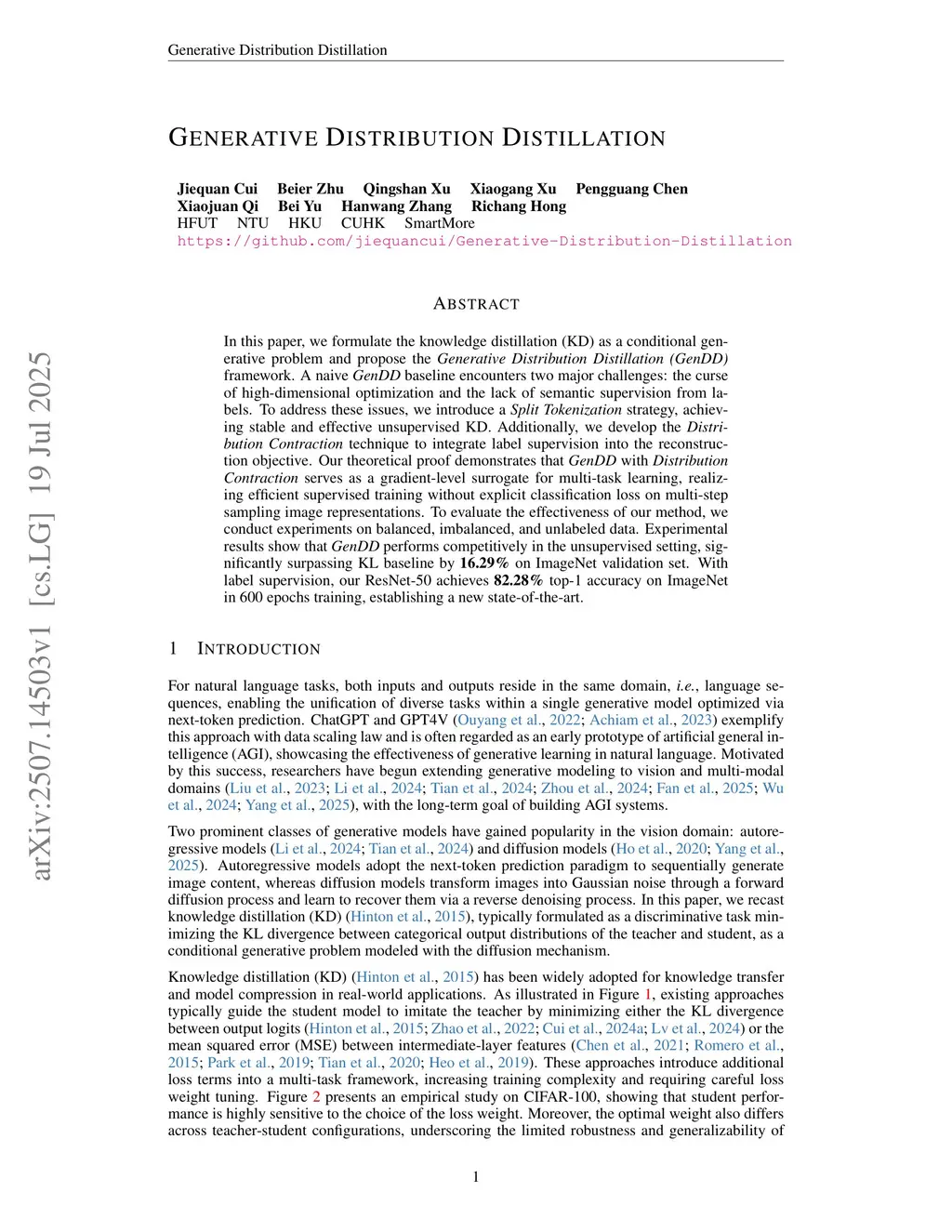 In this paper, we formulate the knowledge distillation (KD) as a conditional generative problem and propose the \textit{Generative Distribution Distillation (GenDD)} framework. A naive \textit{GenDD} baseline encounters two major challenges: the curse of high-dimensional optimization and the lack of semantic supervision from labels. To address these issues, we introduce a \textit{Split Tokenization} strategy, achieving stable and effective unsupervised KD. Additionally, we develop the \textit{Distribution Contraction} technique to integrate label supervision into the reconstruction objective. Our theoretical proof demonstrates that \textit{GenDD} with \textit{Distribution Contraction} serves as a gradient-level surrogate for multi-task learning, realizing efficient supervised training without explicit classification loss on multi-step sampling image representations. To evaluate the effectiveness of our method, we conduct experiments on balanced, imbalanced, and unlabeled data. Experimental results show that \textit{GenDD} performs competitively in the unsupervised setting, significantly surpassing KL baseline by \textbf{16.29\%} on ImageNet validation set. With label supervision, our ResNet-50 achieves \textbf{82.28\%} top-1 accuracy on ImageNet in 600 epochs training, establishing a new state-of-the-art.