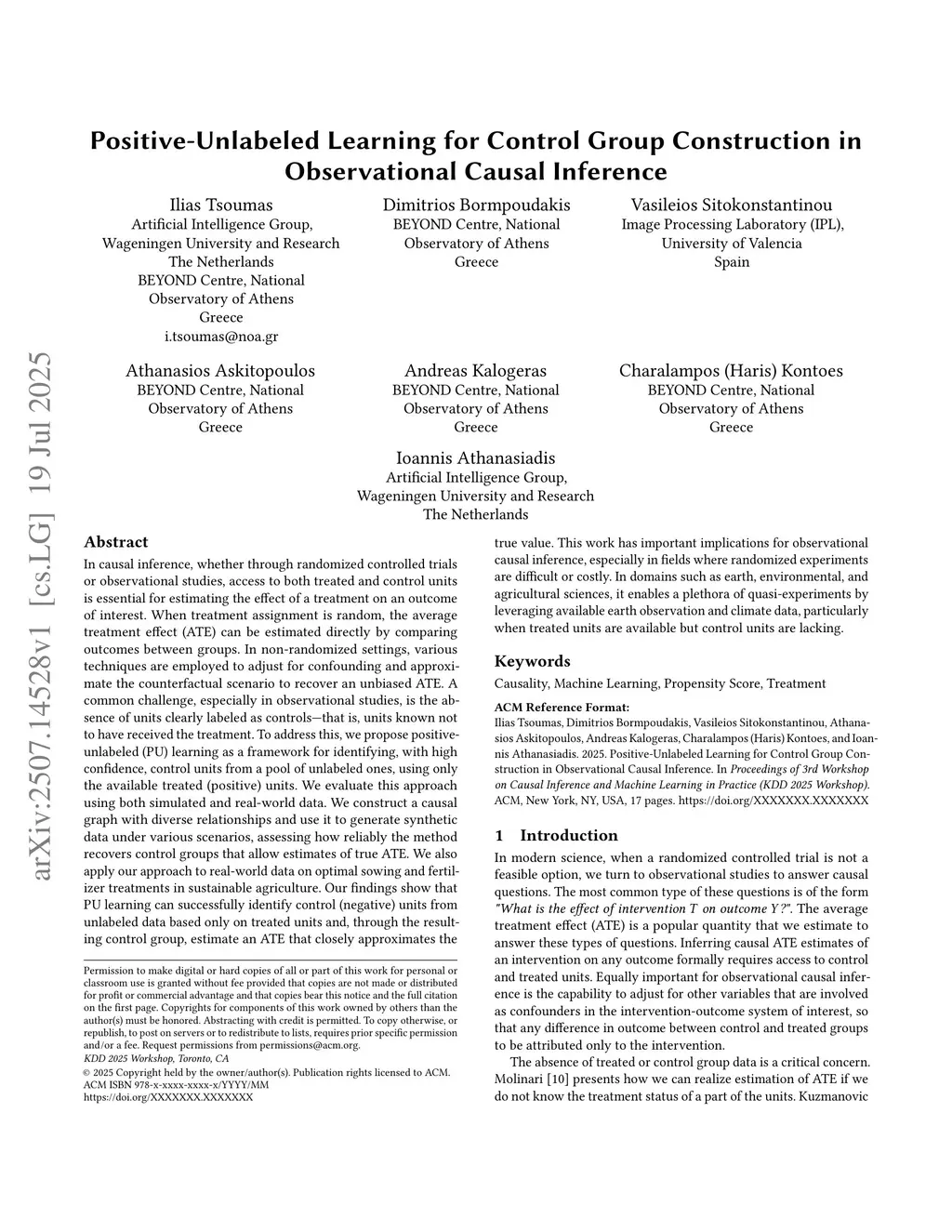 In causal inference, whether through randomized controlled trials or observational studies, access to both treated and control units is essential for estimating the effect of a treatment on an outcome of interest. When treatment assignment is random, the average treatment effect (ATE) can be estimated directly by comparing outcomes between groups. In non-randomized settings, various techniques are employed to adjust for confounding and approximate the counterfactual scenario to recover an unbiased ATE. A common challenge, especially in observational studies, is the absence of units clearly labeled as controls-that is, units known not to have received the treatment. To address this, we propose positive-unlabeled (PU) learning as a framework for identifying, with high confidence, control units from a pool of unlabeled ones, using only the available treated (positive) units. We evaluate this approach using both simulated and real-world data. We construct a causal graph with diverse relationships and use it to generate synthetic data under various scenarios, assessing how reliably the method recovers control groups that allow estimates of true ATE. We also apply our approach to real-world data on optimal sowing and fertilizer treatments in sustainable agriculture. Our findings show that PU learning can successfully identify control (negative) units from unlabeled data based only on treated units and, through the resulting control group, estimate an ATE that closely approximates the true value. This work has important implications for observational causal inference, especially in fields where randomized experiments are difficult or costly. In domains such as earth, environmental, and agricultural sciences, it enables a plethora of quasi-experiments by leveraging available earth observation and climate data, particularly when treated units are available but control units are lacking.