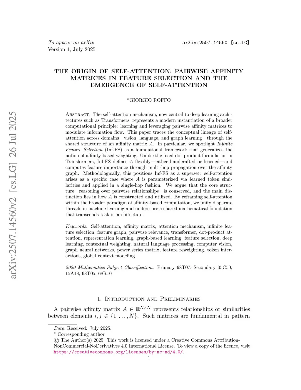 The self-attention mechanism, now central to deep learning architectures such as Transformers, is a modern instance of a more general computational principle: learning and using pairwise affinity matrices to control how information flows through a model. This paper traces the conceptual origins of self-attention across multiple domains, including computer vision, natural language processing, and graph learning, through their shared reliance on an affinity matrix, denoted as A. We highlight Infinite Feature Selection (Inf-FS) as a foundational approach that generalizes the idea of affinity-based weighting. Unlike the fixed dot-product structure used in Transformers, Inf-FS defines A either through domain knowledge or by learning, and computes feature relevance through multi-hop propagation over the affinity graph. From this perspective, self-attention can be seen as a special case of Inf-FS: it uses a single-hop affinity computation where A is dynamically built from token similarities. We argue that the underlying structure, reasoning over pairwise relationships, is preserved across both approaches, and the key differences lie in how the affinity matrix is defined and applied. By situating self-attention within the broader paradigm of affinity-based computation, we unify several strands of machine learning research and highlight a common mathematical foundation that underpins diverse models and tasks.