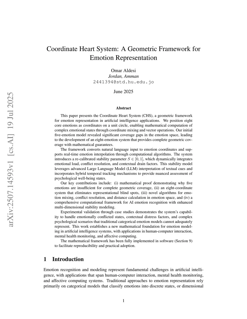 This paper presents the Coordinate Heart System (CHS), a geometric framework for emotion representation in artificial intelligence applications. We position eight core emotions as coordinates on a unit circle, enabling mathematical computation of complex emotional states through coordinate mixing and vector operations. Our initial five-emotion model revealed significant coverage gaps in the emotion space, leading to the development of an eight-emotion system that provides complete geometric coverage with mathematical guarantees. The framework converts natural language input to emotion coordinates and supports real-time emotion interpolation through computational algorithms. The system introduces a re-calibrated stability parameter S in [0,1], which dynamically integrates emotional load, conflict resolution, and contextual drain factors. This stability model leverages advanced Large Language Model interpretation of textual cues and incorporates hybrid temporal tracking mechanisms to provide nuanced assessment of psychological well-being states. Our key contributions include: (i) mathematical proof demonstrating why five emotions are insufficient for complete geometric coverage, (ii) an eight-coordinate system that eliminates representational blind spots, (iii) novel algorithms for emotion mixing, conflict resolution, and distance calculation in emotion space, and (iv) a comprehensive computational framework for AI emotion recognition with enhanced multi-dimensional stability modeling. Experimental validation through case studies demonstrates the system's capability to handle emotionally conflicted states, contextual distress factors, and complex psychological scenarios that traditional categorical emotion models cannot adequately represent. This work establishes a new mathematical foundation for emotion modeling in artificial intelligence systems.