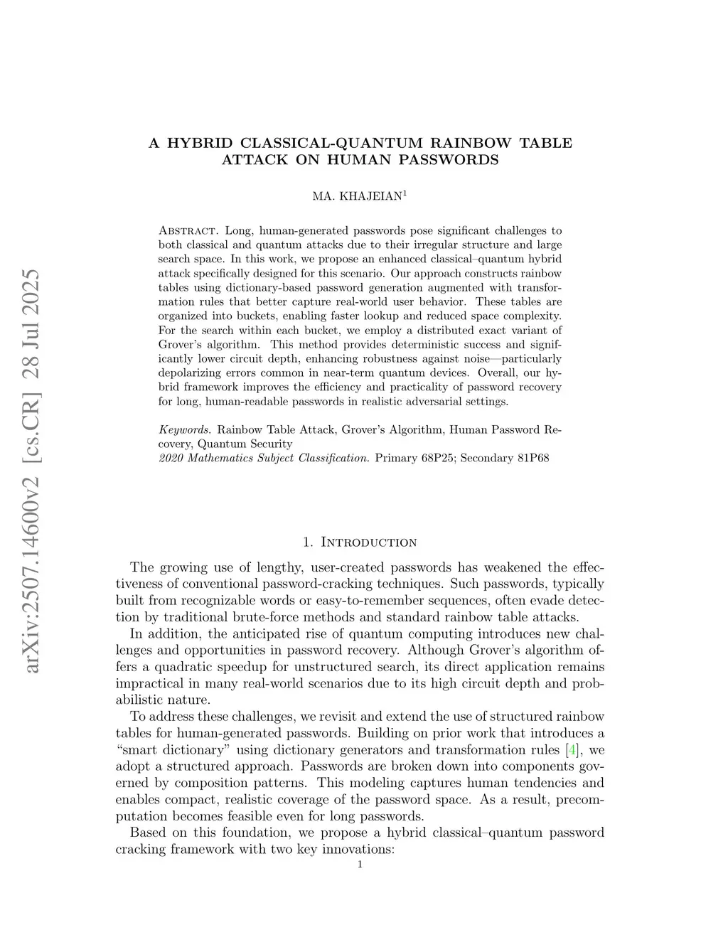 Long, human-generated passwords pose significant challenges to both classical and quantum attacks due to their irregular structure and large search space. In this work, we propose an enhanced classical-quantum hybrid attack specifically designed for this scenario. Our approach constructs rainbow tables using dictionary-based password generation augmented with transformation rules that better capture real-world user behavior. These tables are organized into buckets, enabling faster lookup and reduced space complexity. For the search within each bucket, we employ a distributed exact variant of Grover's algorithm. This method provides deterministic success and significantly lower circuit depth, enhancing robustness against noise-particularly depolarizing errors common in near-term quantum devices. Overall, our hybrid framework improves the efficiency and practicality of password recovery for long, human-readable passwords in realistic adversarial settings.