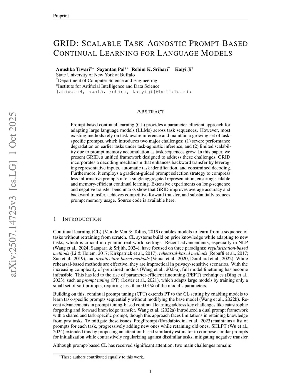 GRID: Scalable Task-Agnostic Prompt-Based Continual Learning for Language Models