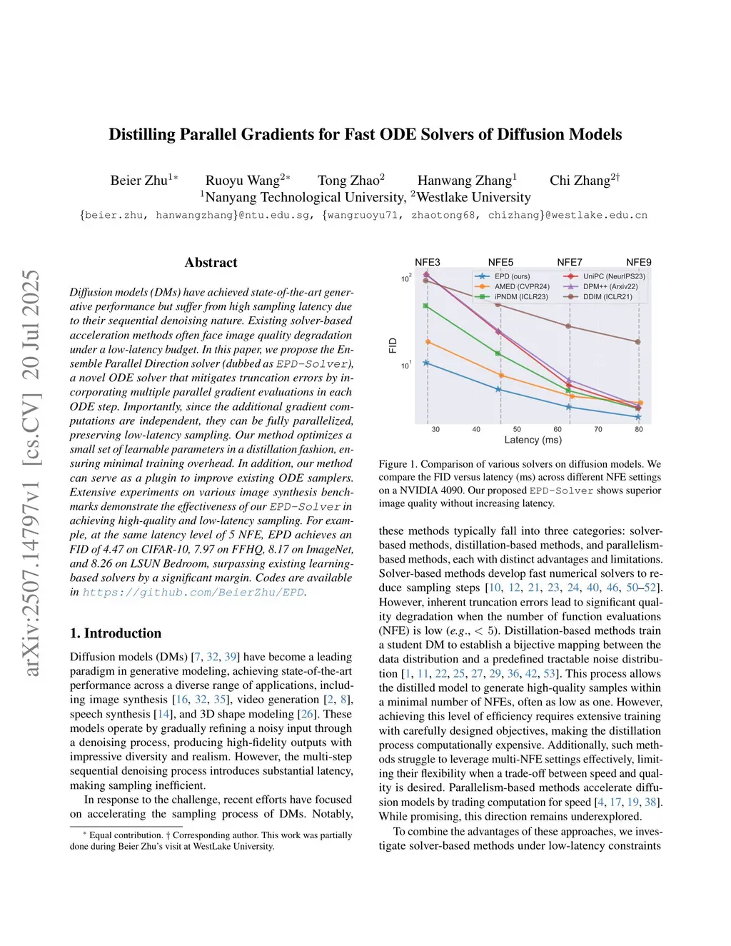 Diffusion models (DMs) have achieved state-of-the-art generative performance but suffer from high sampling latency due to their sequential denoising nature. Existing solver-based acceleration methods often face image quality degradation under a low-latency budget. In this paper, we propose the Ensemble Parallel Direction solver (dubbed as \ours), a novel ODE solver that mitigates truncation errors by incorporating multiple parallel gradient evaluations in each ODE step. Importantly, since the additional gradient computations are independent, they can be fully parallelized, preserving low-latency sampling.Our method optimizes a small set of learnable parameters in a distillation fashion, ensuring minimal training overhead.In addition, our method can serve as a plugin to improve existing ODE samplers. Extensive experiments on various image synthesis benchmarks demonstrate the effectiveness of our \ours~in achieving high-quality and low-latency sampling. For example, at the same latency level of 5 NFE, EPD achieves an FID of 4.47 on CIFAR-10, 7.97 on FFHQ, 8.17 on ImageNet, and 8.26 on LSUN Bedroom, surpassing existing learning-based solvers by a significant margin. Codes are available inthis https URL.