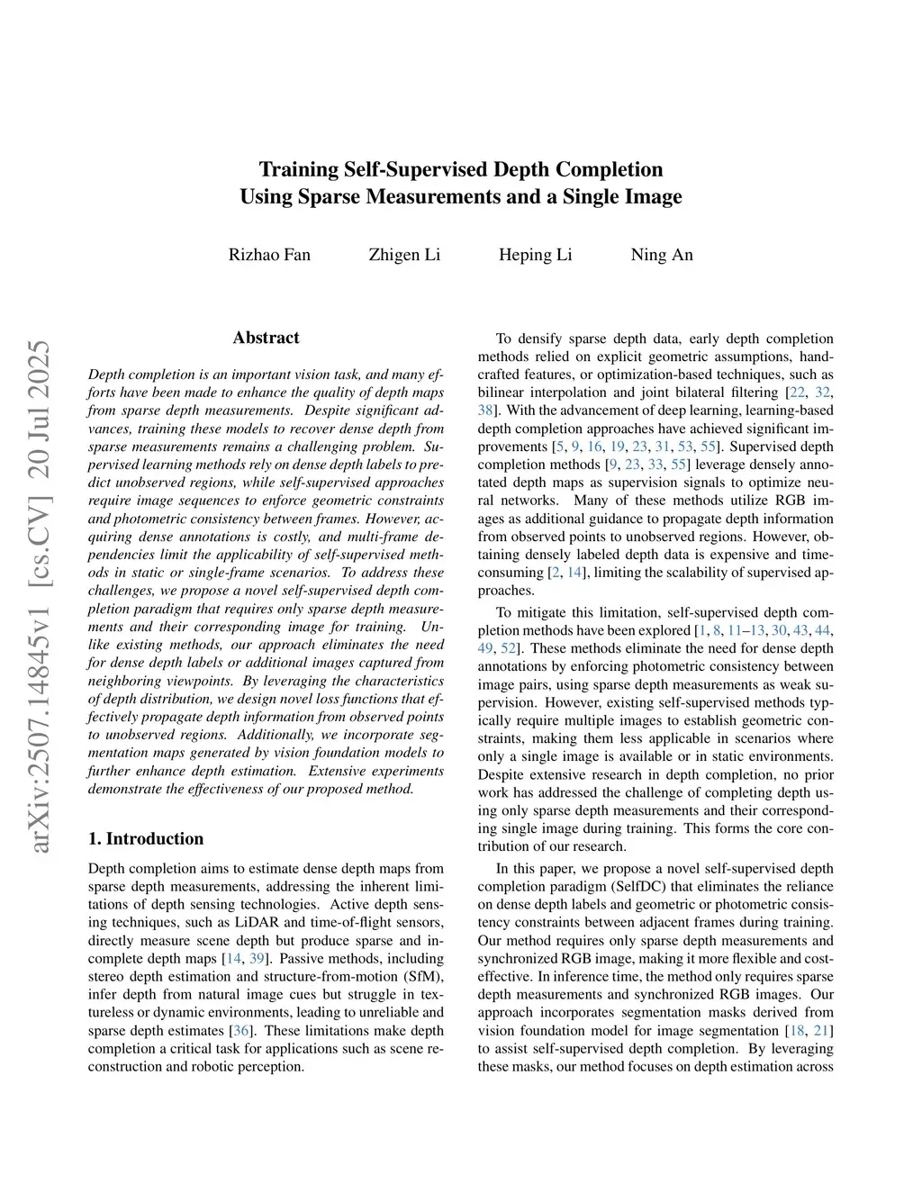 Depth completion is an important vision task, and many efforts have been made to enhance the quality of depth maps from sparse depth measurements. Despite significant advances, training these models to recover dense depth from sparse measurements remains a challenging problem. Supervised learning methods rely on dense depth labels to predict unobserved regions, while self-supervised approaches require image sequences to enforce geometric constraints and photometric consistency between frames. However, acquiring dense annotations is costly, and multi-frame dependencies limit the applicability of self-supervised methods in static or single-frame scenarios. To address these challenges, we propose a novel self-supervised depth completion paradigm that requires only sparse depth measurements and their corresponding image for training. Unlike existing methods, our approach eliminates the need for dense depth labels or additional images captured from neighboring viewpoints. By leveraging the characteristics of depth distribution, we design novel loss functions that effectively propagate depth information from observed points to unobserved regions. Additionally, we incorporate segmentation maps generated by vision foundation models to further enhance depth estimation. Extensive experiments demonstrate the effectiveness of our proposed method.