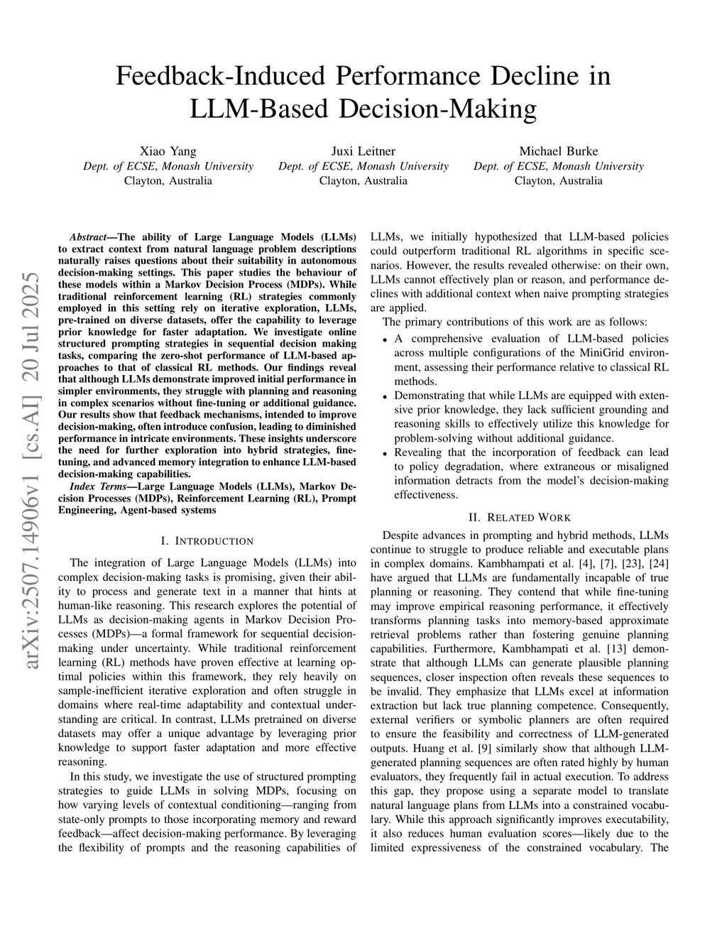 The ability of Large Language Models (LLMs) to extract context from natural language problem descriptions naturally raises questions about their suitability in autonomous decision-making settings. This paper studies the behaviour of these models within a Markov Decision Process (MDPs). While traditional reinforcement learning (RL) strategies commonly employed in this setting rely on iterative exploration, LLMs, pre-trained on diverse datasets, offer the capability to leverage prior knowledge for faster adaptation. We investigate online structured prompting strategies in sequential decision making tasks, comparing the zero-shot performance of LLM-based approaches to that of classical RL methods. Our findings reveal that although LLMs demonstrate improved initial performance in simpler environments, they struggle with planning and reasoning in complex scenarios without fine-tuning or additional guidance. Our results show that feedback mechanisms, intended to improve decision-making, often introduce confusion, leading to diminished performance in intricate environments. These insights underscore the need for further exploration into hybrid strategies, fine-tuning, and advanced memory integration to enhance LLM-based decision-making capabilities.