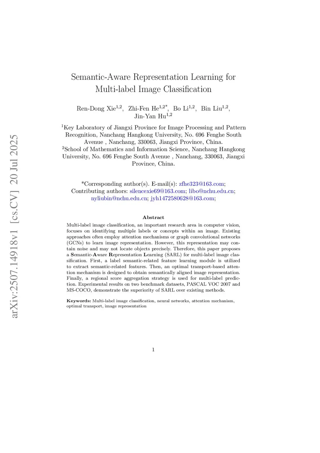 Multi-label image classification is a critical task in machine learning that aims to accurately assign multiple labels to a single image. While existing methods often utilize attention mechanisms or graph convolutional networks to model visual representations, their performance is still constrained by two critical limitations: the inability to learn discriminative semantic-aware features, and the lack of fine-grained alignment between visual representations and label embeddings. To tackle these issues in a unified framework, this paper proposes a novel approach named Semantic-aware representation learning via Conditional Transport for Multi-Label Image Classification (SCT). The proposed method introduces a semantic-related feature learning module that extracts discriminative label-specific features by emphasizing semantic relevance and interaction, along with a conditional transport-based alignment mechanism that enables precise visual-semantic alignment. Extensive experiments on two widely-used benchmark datasets, VOC2007 and MS-COCO, validate the effectiveness of SCT and demonstrate its superior performance compared to existing state-of-the-art methods.