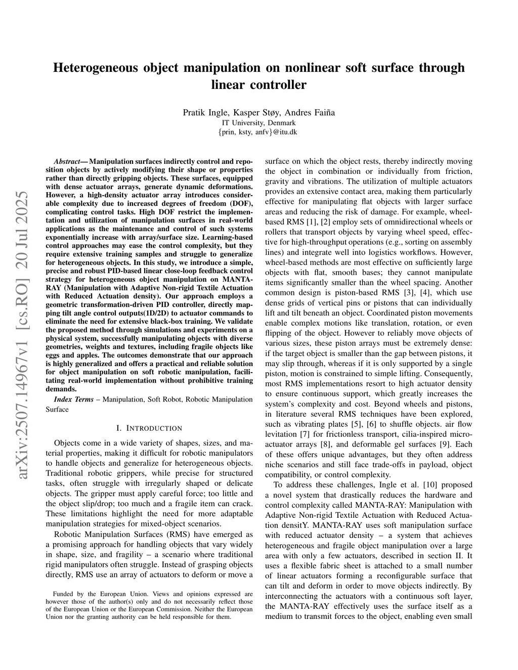 Heterogeneous object manipulation on nonlinear soft surface through linear controller