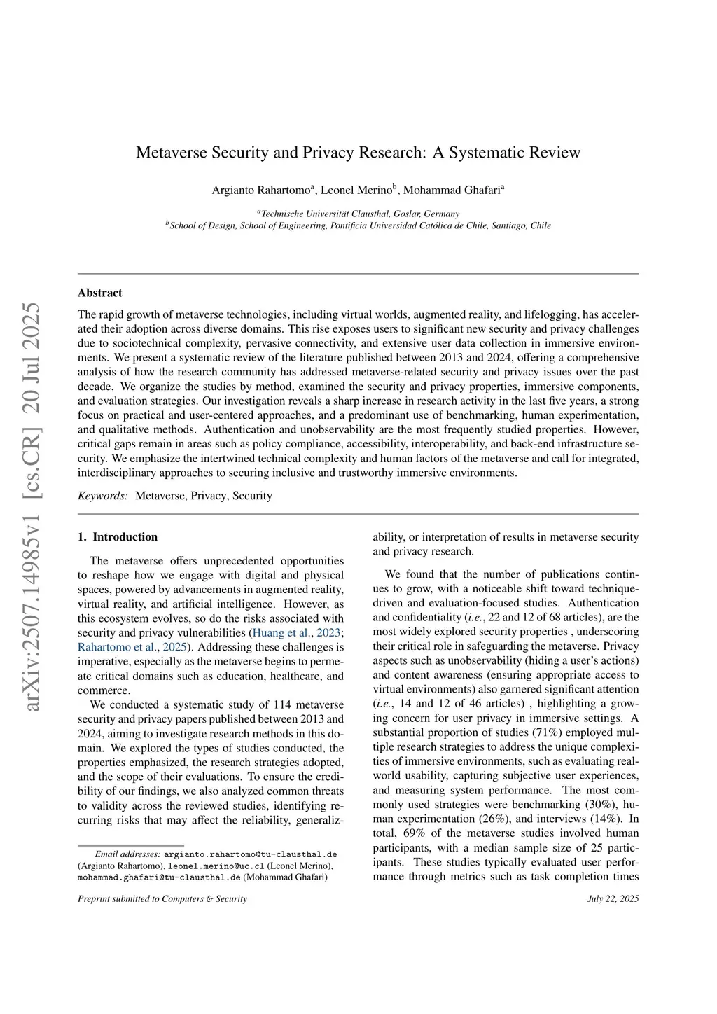 The rapid growth of metaverse technologies, including virtual worlds, augmented reality, and lifelogging, has accelerated their adoption across diverse domains. This rise exposes users to significant new security and privacy challenges due to sociotechnical complexity, pervasive connectivity, and extensive user data collection in immersive environments. We present a systematic review of the literature published between 2013 and 2024, offering a comprehensive analysis of how the research community has addressed metaverse-related security and privacy issues over the past decade. We organize the studies by method, examined the security and privacy properties, immersive components, and evaluation strategies. Our investigation reveals a sharp increase in research activity in the last five years, a strong focus on practical and user-centered approaches, and a predominant use of benchmarking, human experimentation, and qualitative methods. Authentication and unobservability are the most frequently studied properties. However, critical gaps remain in areas such as policy compliance, accessibility, interoperability, and back-end infrastructure security. We emphasize the intertwined technical complexity and human factors of the metaverse and call for integrated, interdisciplinary approaches to securing inclusive and trustworthy immersive environments.