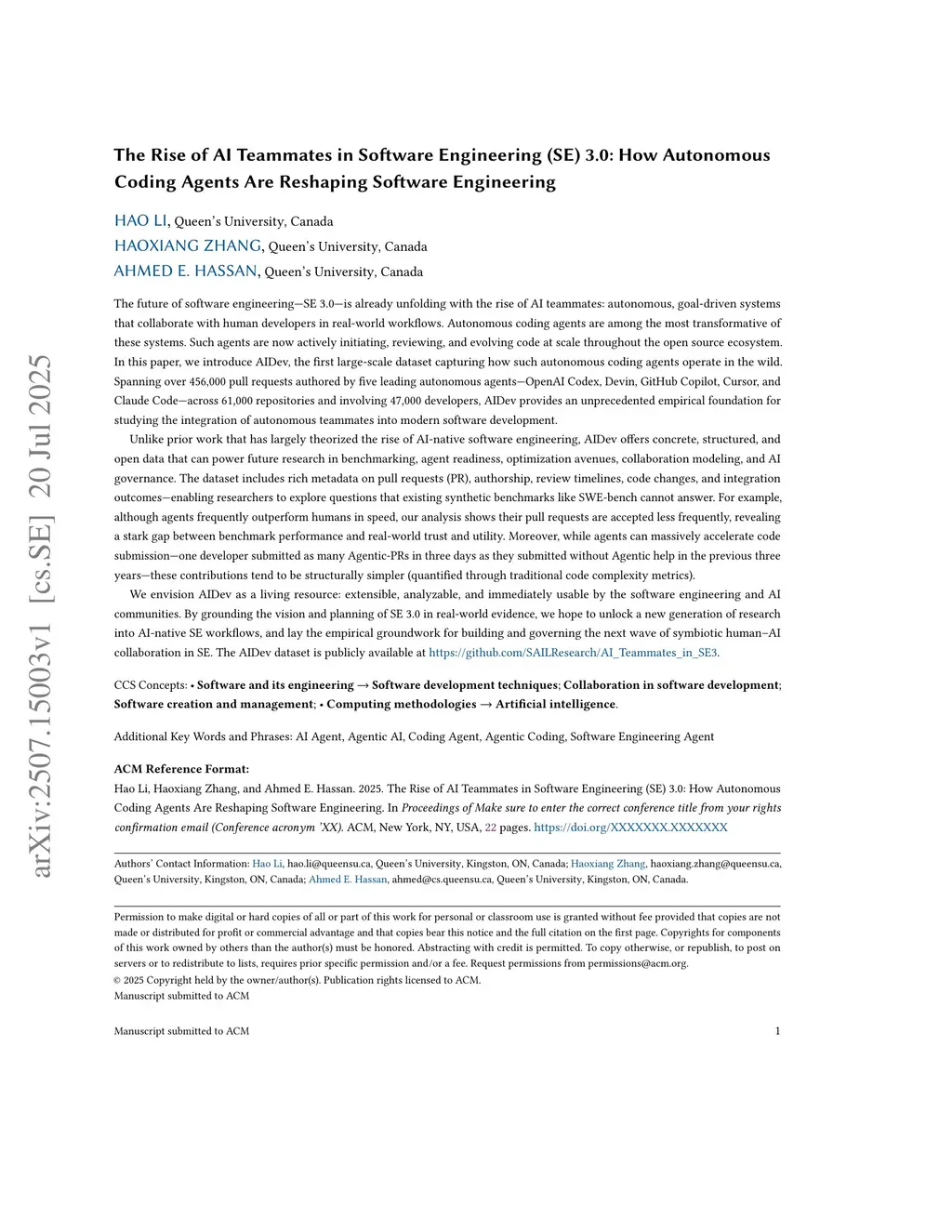 The future of software engineering--SE 3.0--is unfolding with the rise of AI teammates: autonomous, goal-driven systems collaborating with human developers. Among these, autonomous coding agents are especially transformative, now actively initiating, reviewing, and evolving code at scale. This paper introduces AIDev, the first large-scale dataset capturing how such agents operate in the wild. Spanning over 456,000 pull requests by five leading agents--OpenAI Codex, Devin, GitHub Copilot, Cursor, and Claude Code--across 61,000 repositories and 47,000 developers, AIDev provides an unprecedented empirical foundation for studying autonomous teammates in software development.Unlike prior work that has largely theorized the rise of AI-native software engineering, AIDev offers structured, open data to support research in benchmarking, agent readiness, optimization, collaboration modeling, and AI governance. The dataset includes rich metadata on PRs, authorship, review timelines, code changes, and integration outcomes--enabling exploration beyond synthetic benchmarks like SWE-bench. For instance, although agents often outperform humans in speed, their PRs are accepted less frequently, revealing a trust and utility gap. Furthermore, while agents accelerate code submission--one developer submitted as many PRs in three days as they had in three years--these are structurally simpler (via code complexity metrics).We envision AIDev as a living resource: extensible, analyzable, and ready for the SE and AI communities. Grounding SE 3.0 in real-world evidence, AIDev enables a new generation of research into AI-native workflows and supports building the next wave of symbiotic human-AI collaboration. The dataset is publicly available atthis https URL.> AI Agent, Agentic AI, Coding Agent, Agentic Coding, Software Engineering Agent
